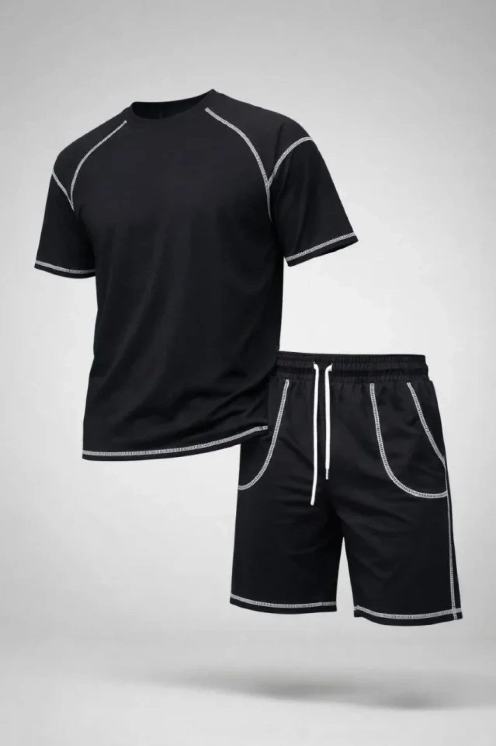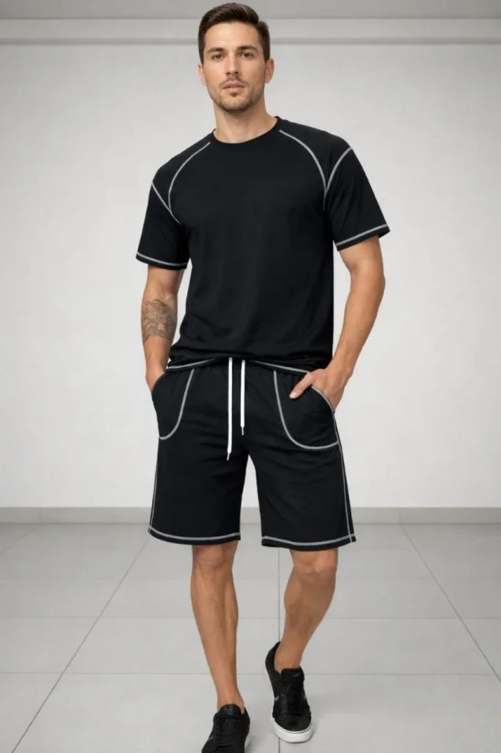 Erkek Spor Tişört Şort Takım Kontrast Dikiş Detaylı Ovarsize Rahat Kalıp - Siyah