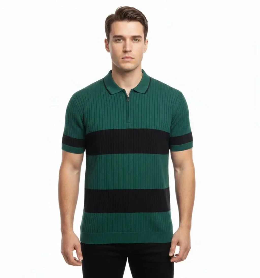 Erkek T-shirt Çizgili Triko Dokuma Kumaş Polo Yaka Yarım Fermuarlı Regular Kalıp Tişört - Çağla Yeşili