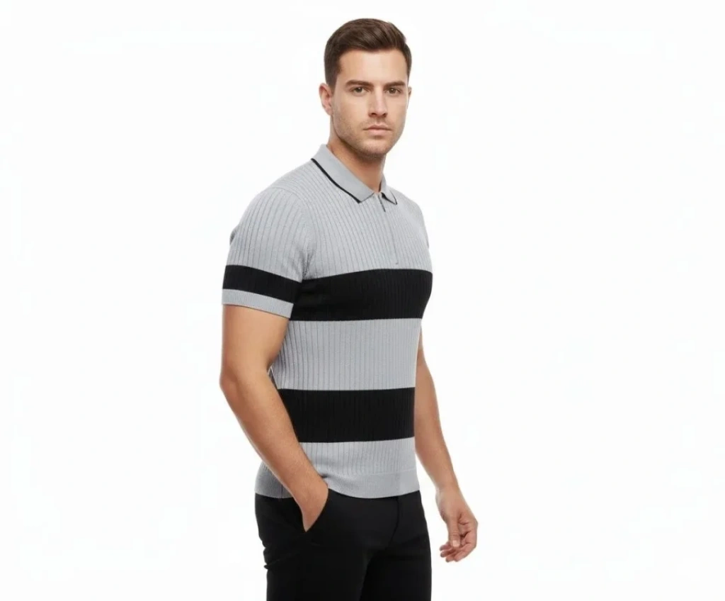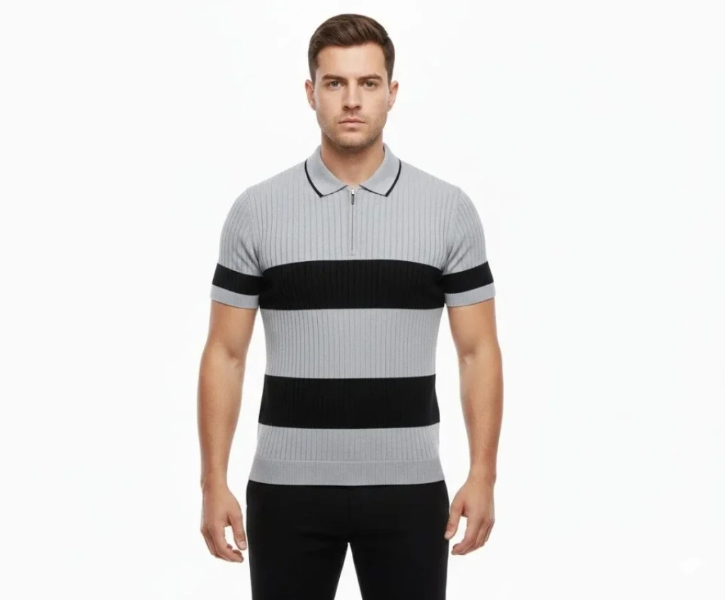 Erkek T-shirt Çizgili Triko Dokuma Kumaş Polo Yaka Yarım Fermuarlı Regular Kalıp Tişört - Gri