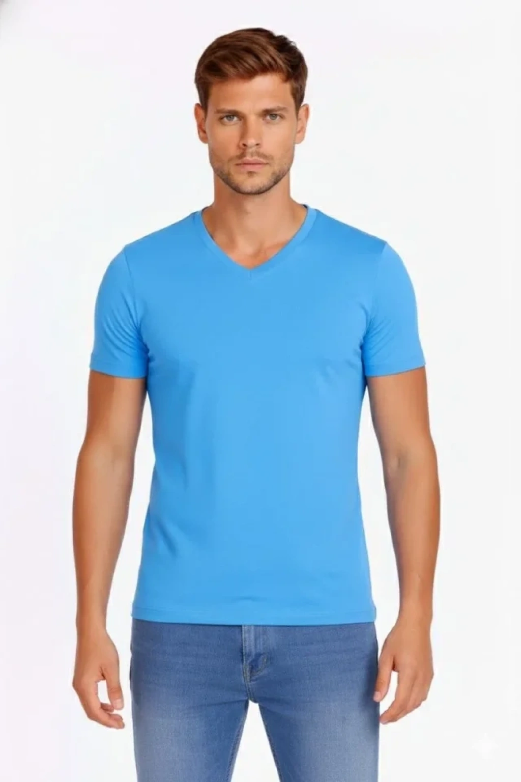 Erkek T-Shirt V Yaka Slim Fit Dar Kesim Likralı Tişört Günlük Basic Body - Açık Mavi
