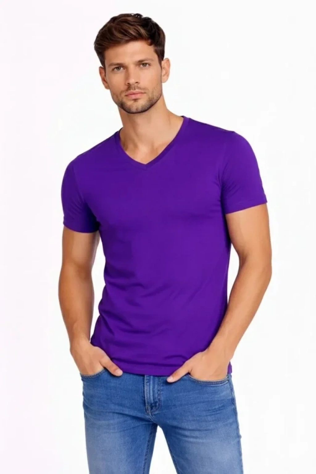 Erkek T-Shirt V Yaka Slim Fit Dar Kesim Likralı Tişört Günlük Basic Body - Mor