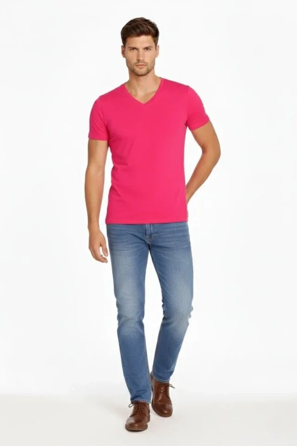 Erkek T-Shirt V Yaka Slim Fit Dar Kesim Likralı Tişört Günlük Basic Body - Pembe