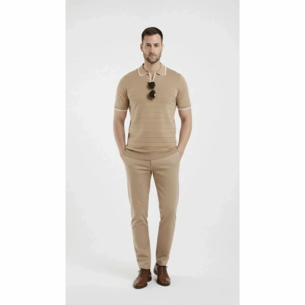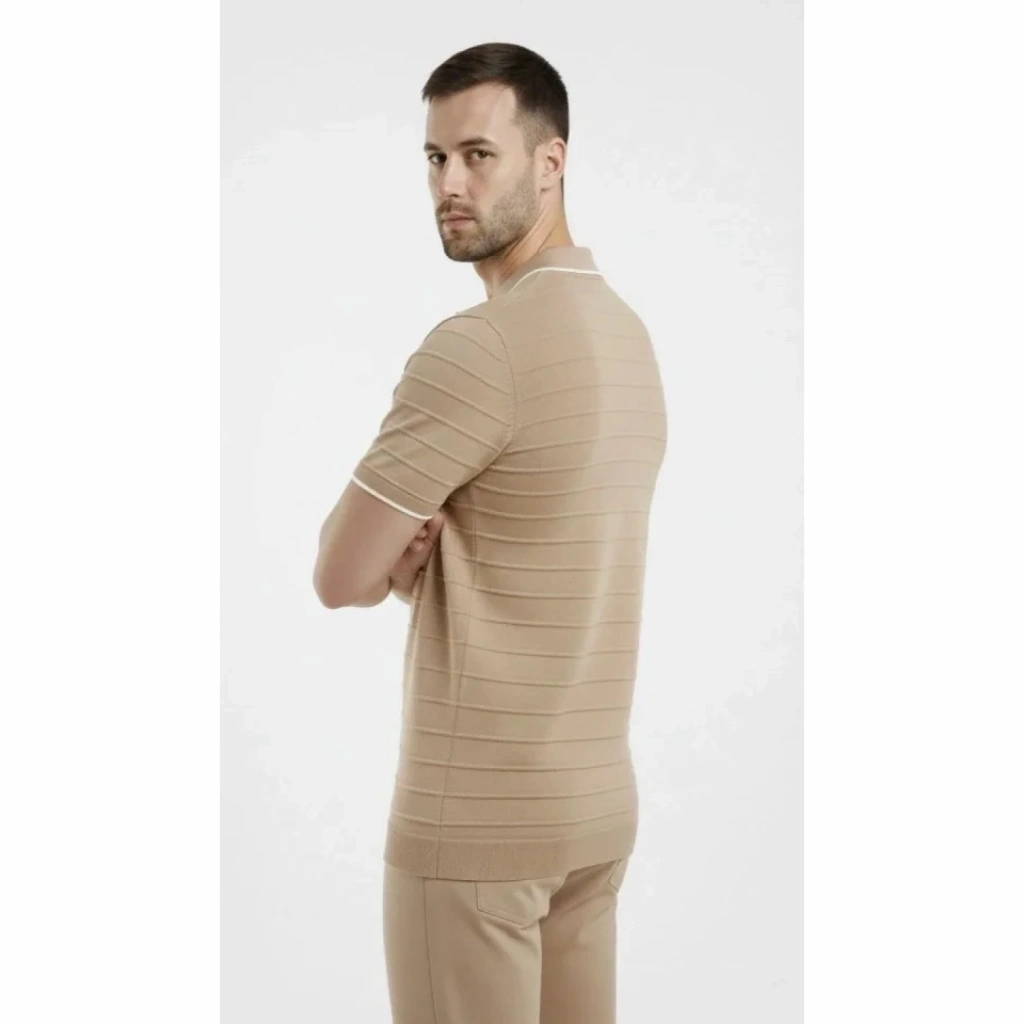 Erkek Triko Kumaş Yakalı Düğmesiz Açık Yaka Fitilli Kısa Kollu Regular Fit Tişört T-shirt - Bej