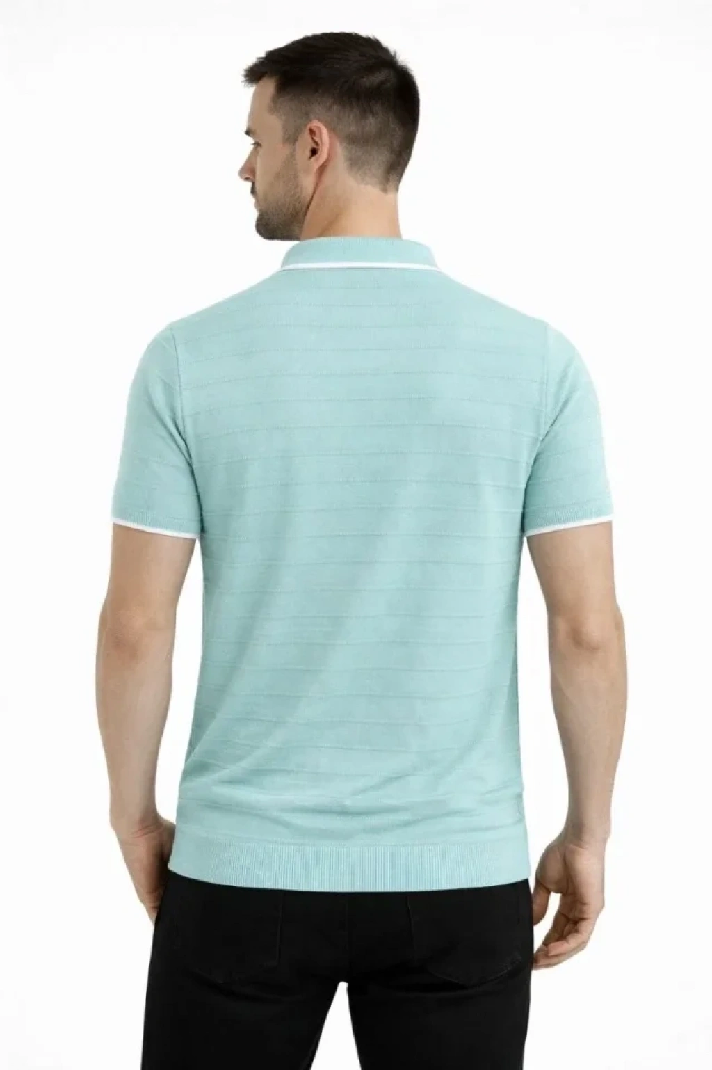Erkek Triko Kumaş Yakalı Düğmesiz Açık Yaka Fitilli Kısa Kollu Regular Fit Tişört T-shirt - Mint Yeşili