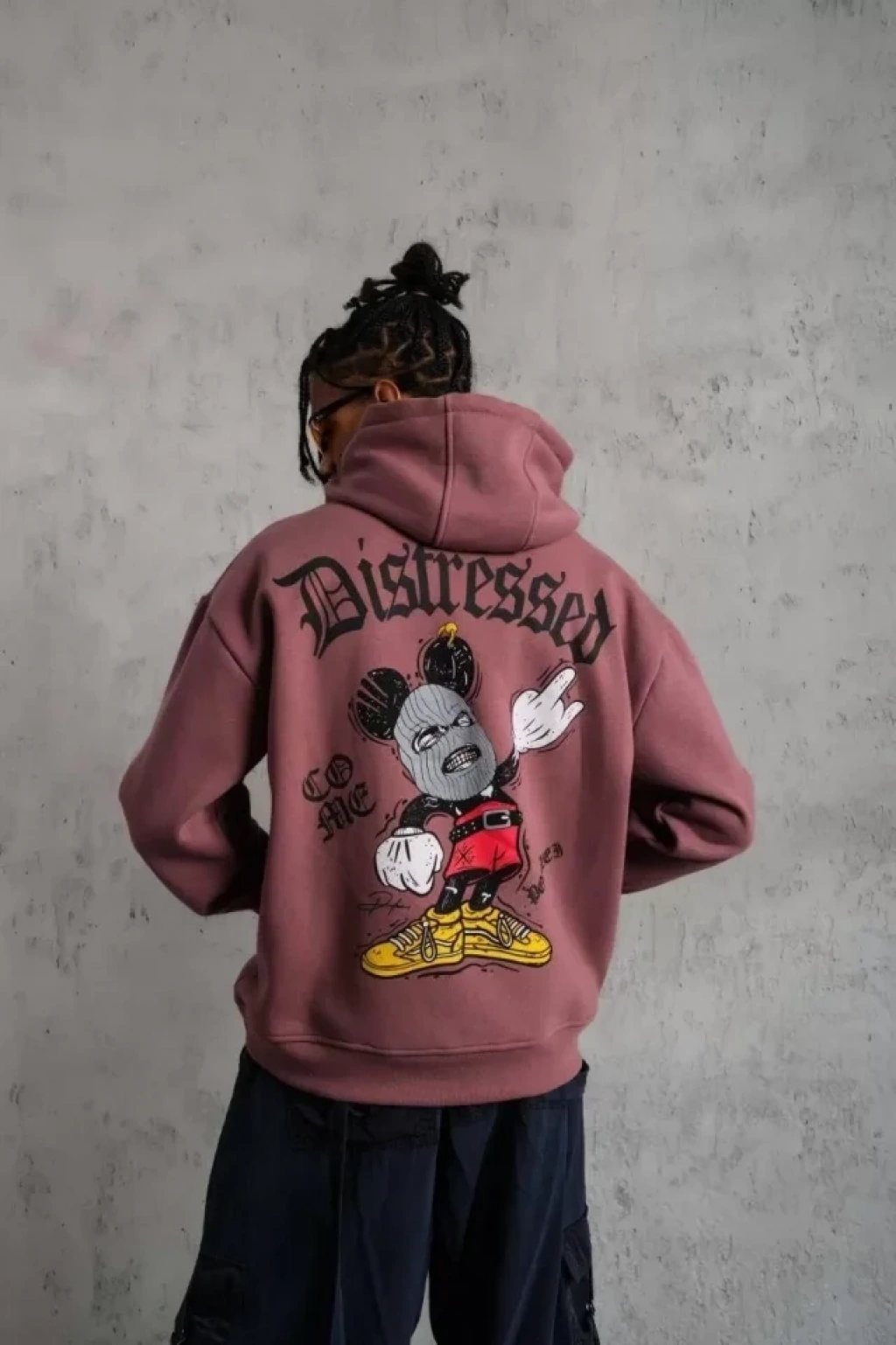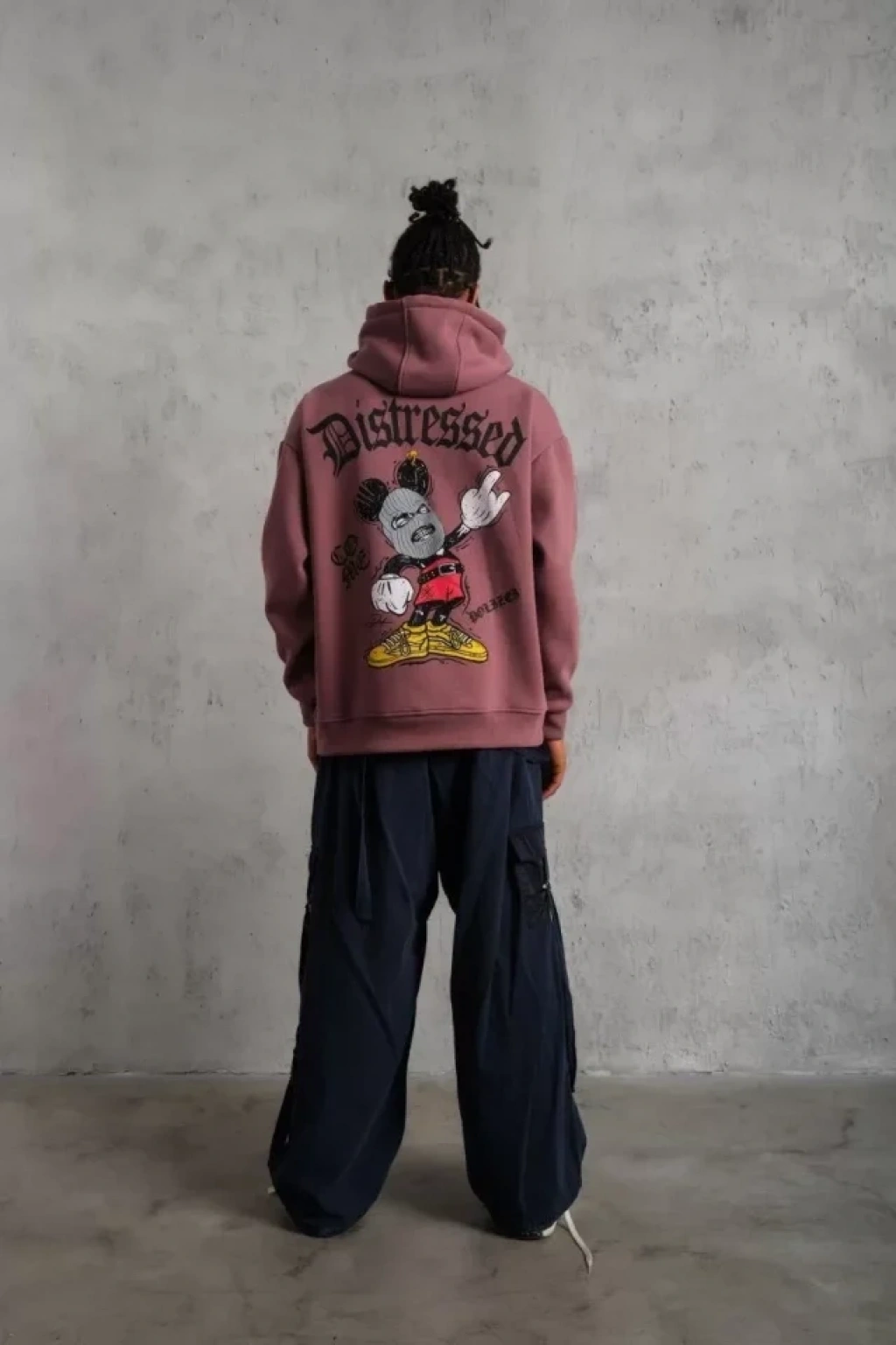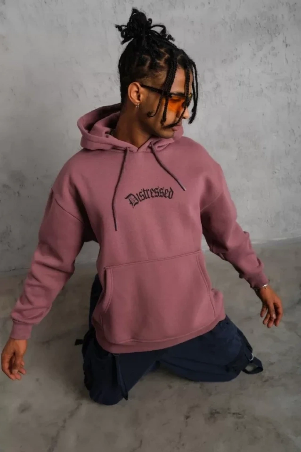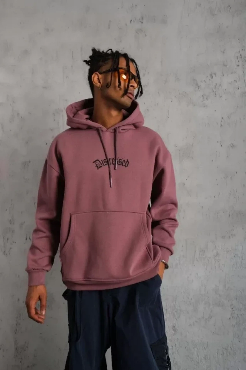 Erkek Üç İplik Baskılı Kapüşonlu Sweat - Gül Kurusu
