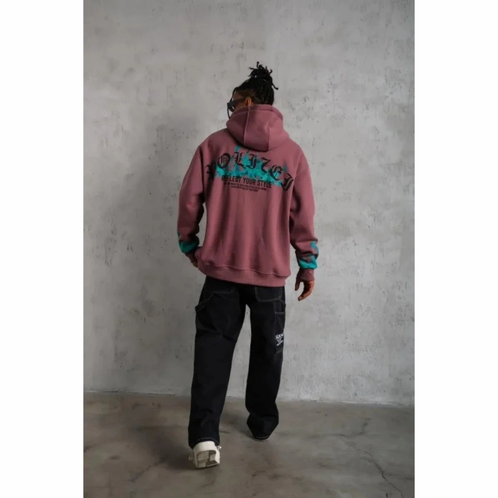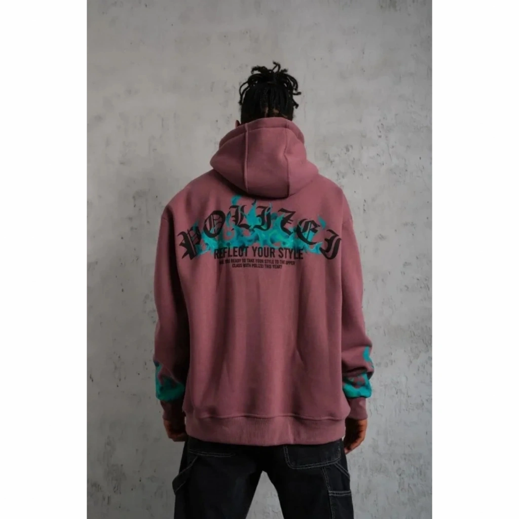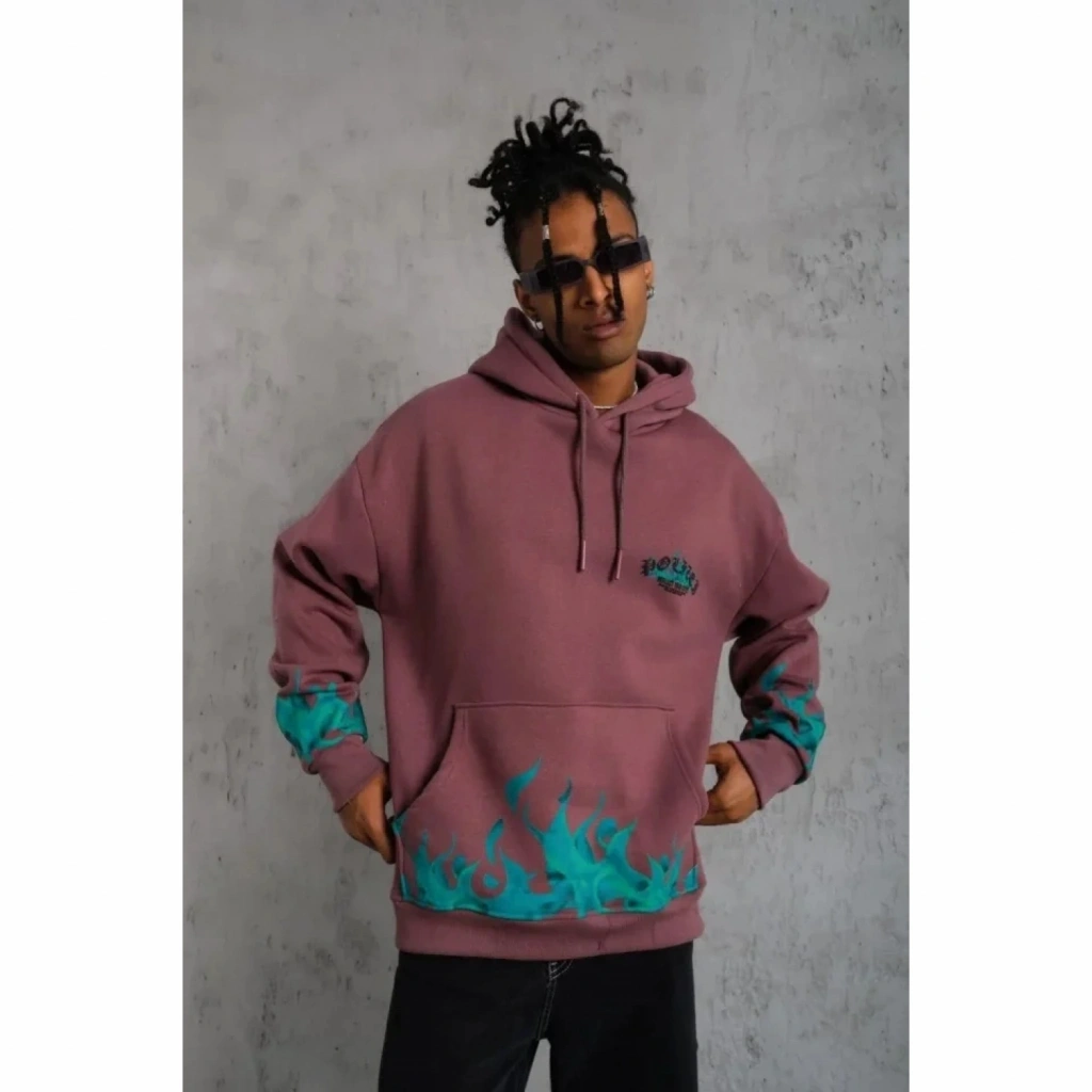 Erkek Üç İplik Içi Pamuklu Alev Baskılı Kapüşonlu Sweatshirt - Gül Kurusu