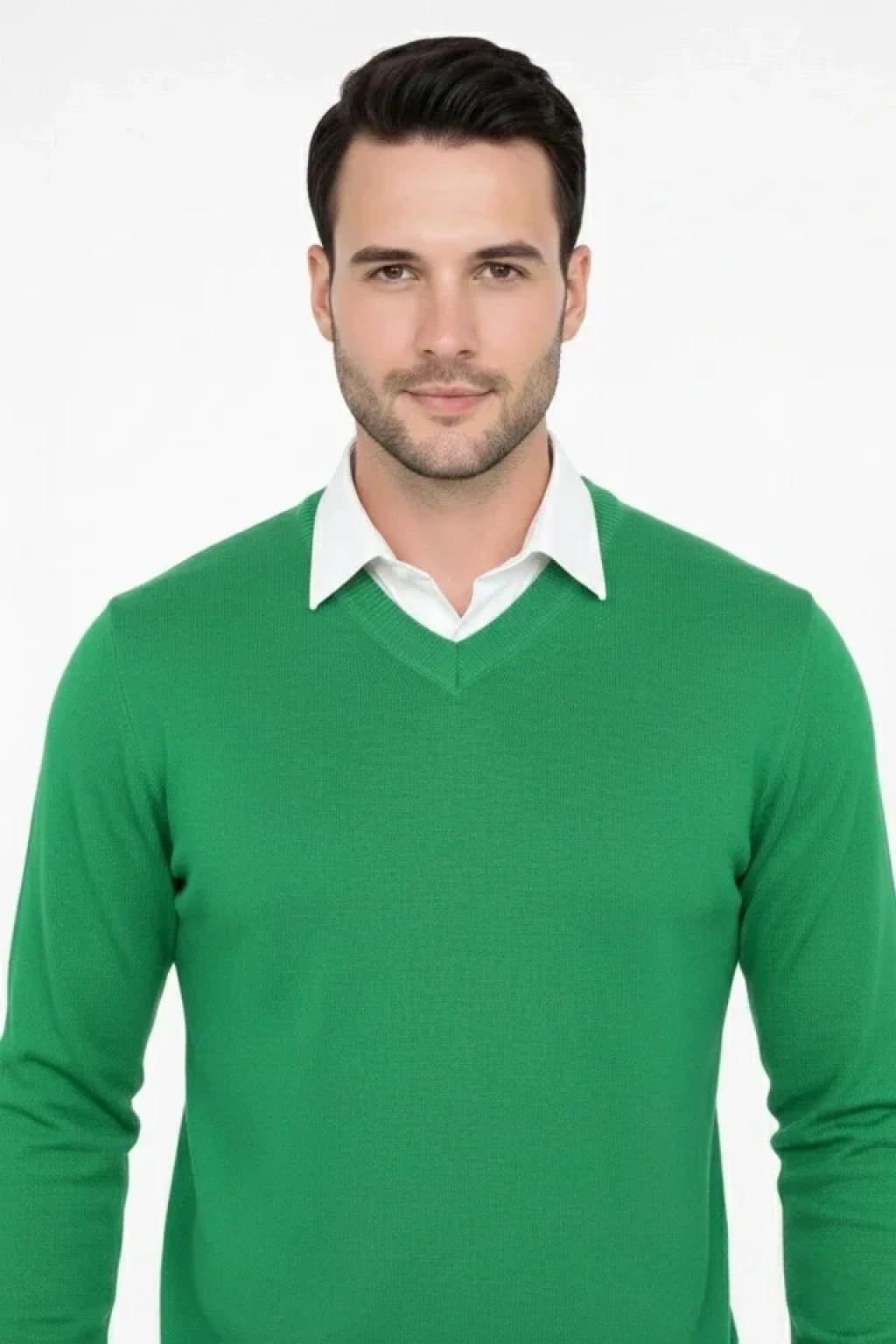 Erkek V Yaka Triko Kazak Yumuşak Dokulu Pamuklu Ince Dokuma, Uzun Kollu Rahat Regular Kalıp - Çimen Yeşili