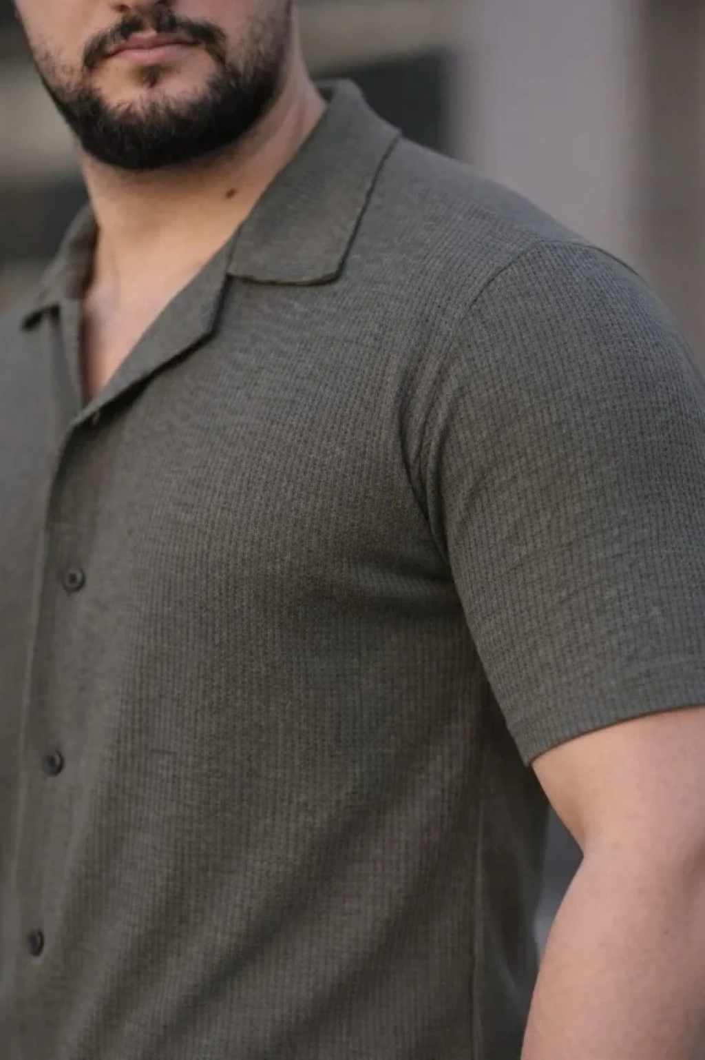 Erkek Waffle Kumaş Kısa Kollu Gömlek Şort Takım Regular Fit Yazlık İkili Set - Haki