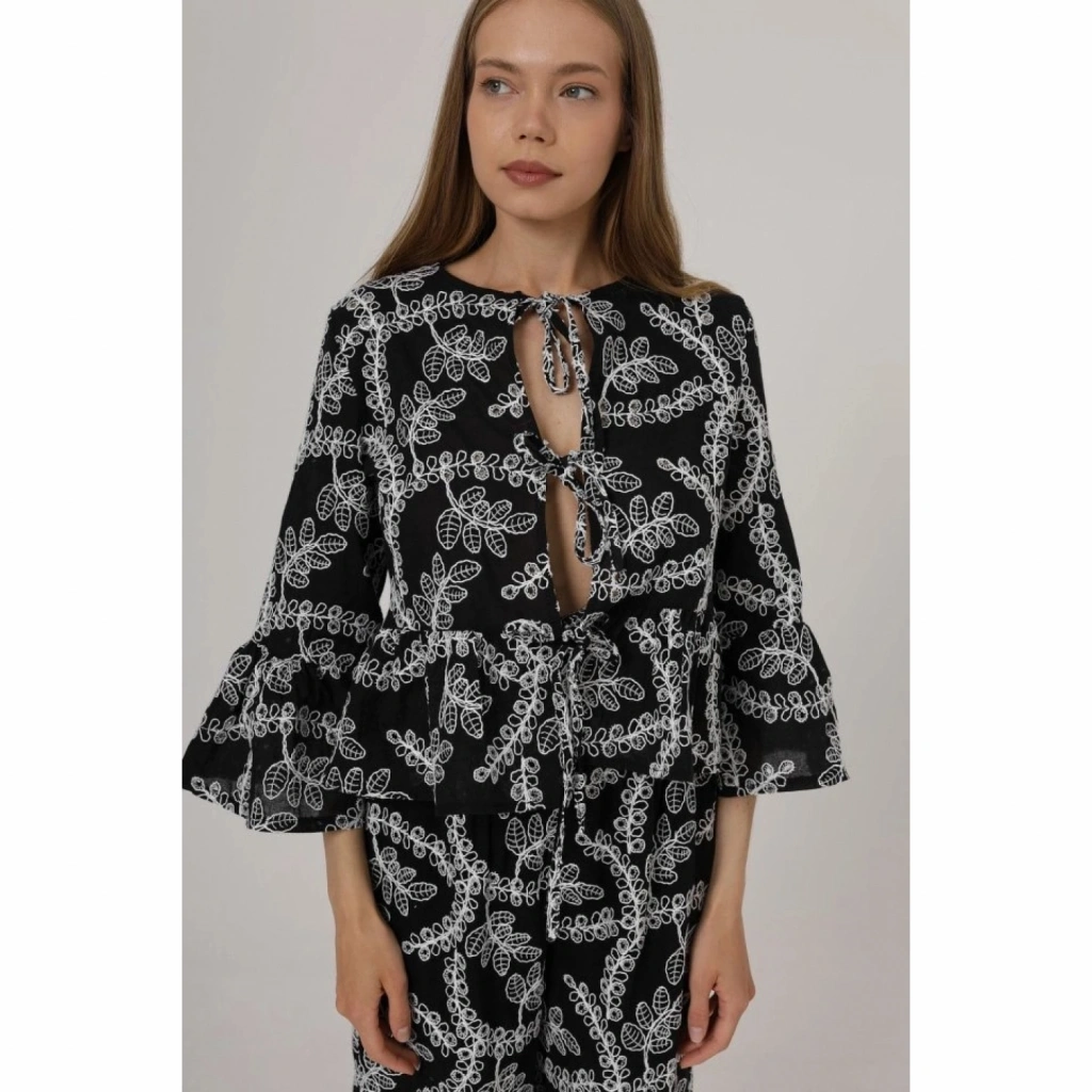 Fiyonk Bağlamalı Brode Bluz - Siyah