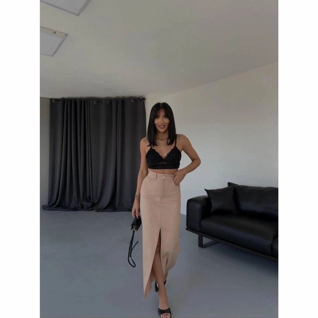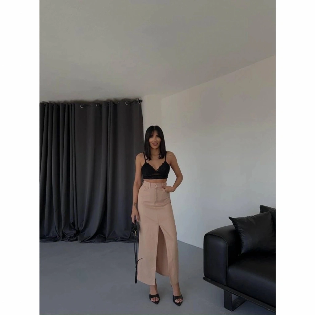 GABARDİN UZUN ÖNDEN YIRTMAÇLI ETEK - Kahverengi