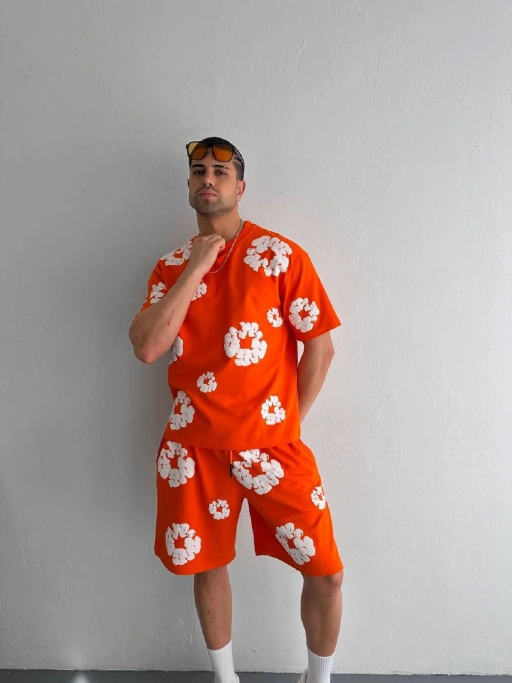 İki İplik Kumaş Baskılı T-shirt Şortlu Takım- Turuncu