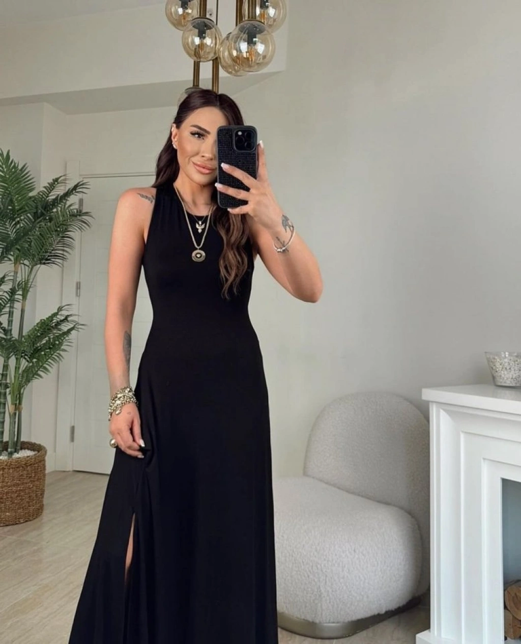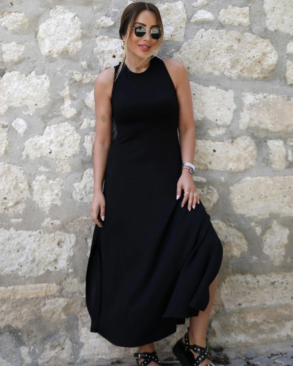 Kadın Arkadan çapraz Detay Yuvarlak Yaka Maksi Viskon Elbise