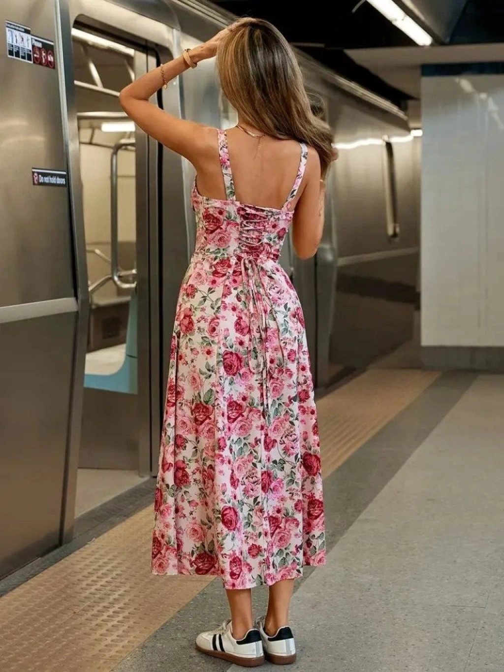 Kadın Askılı Geniş V Yakalı Sırttan Bağlamalı Yırtmaçlı Süprem Elbise
