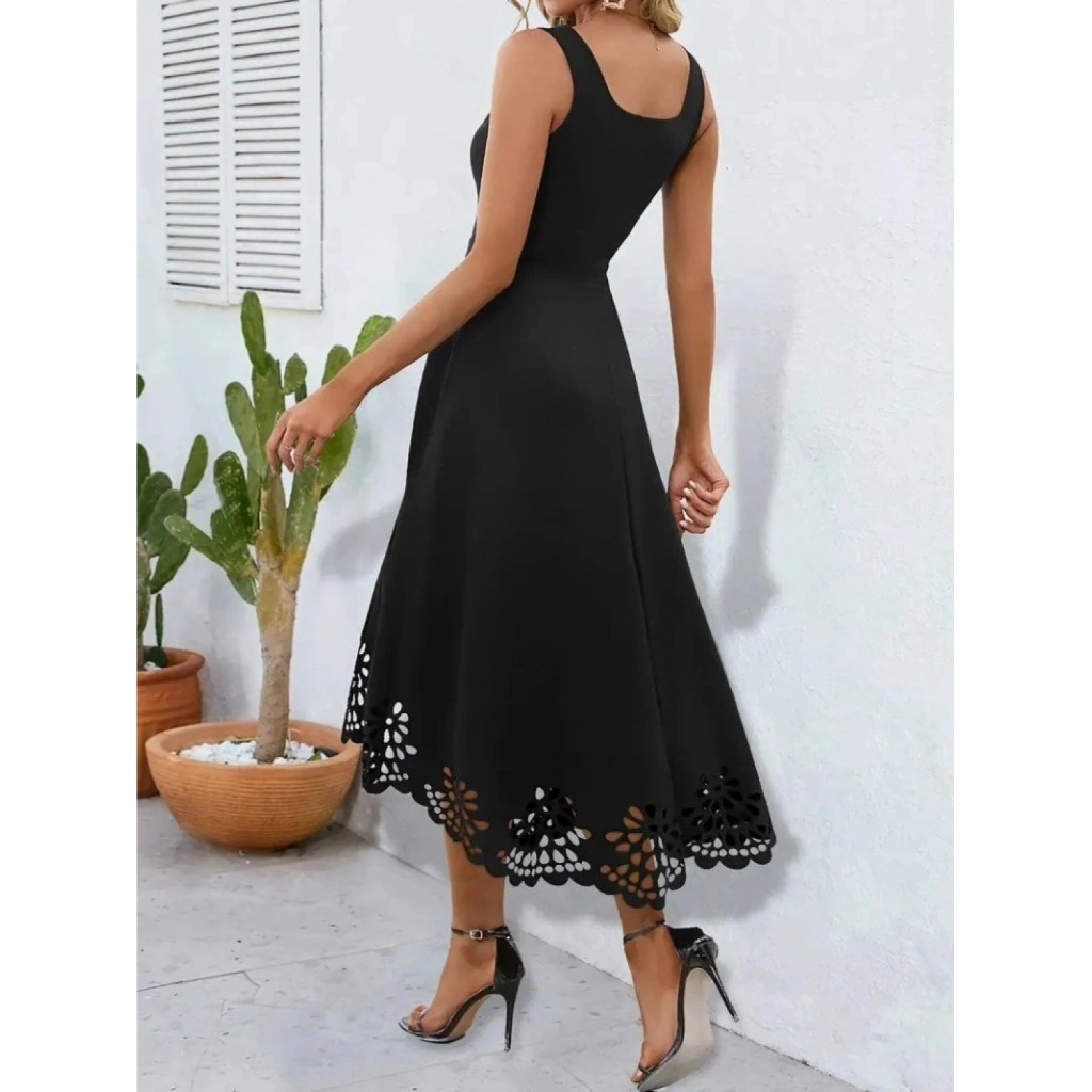 Kadın Askılı Geometrik Yaka çiçek Lazer Kesim Ithal Krep Elbise