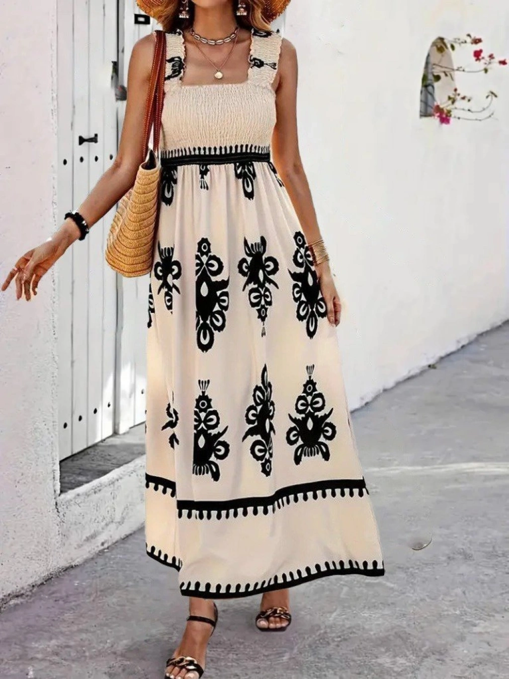 Kadın Askılı Kare Yaka Gipe Detaylı Desenli Suprem Elbise