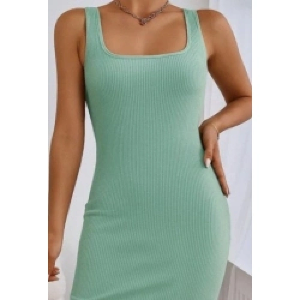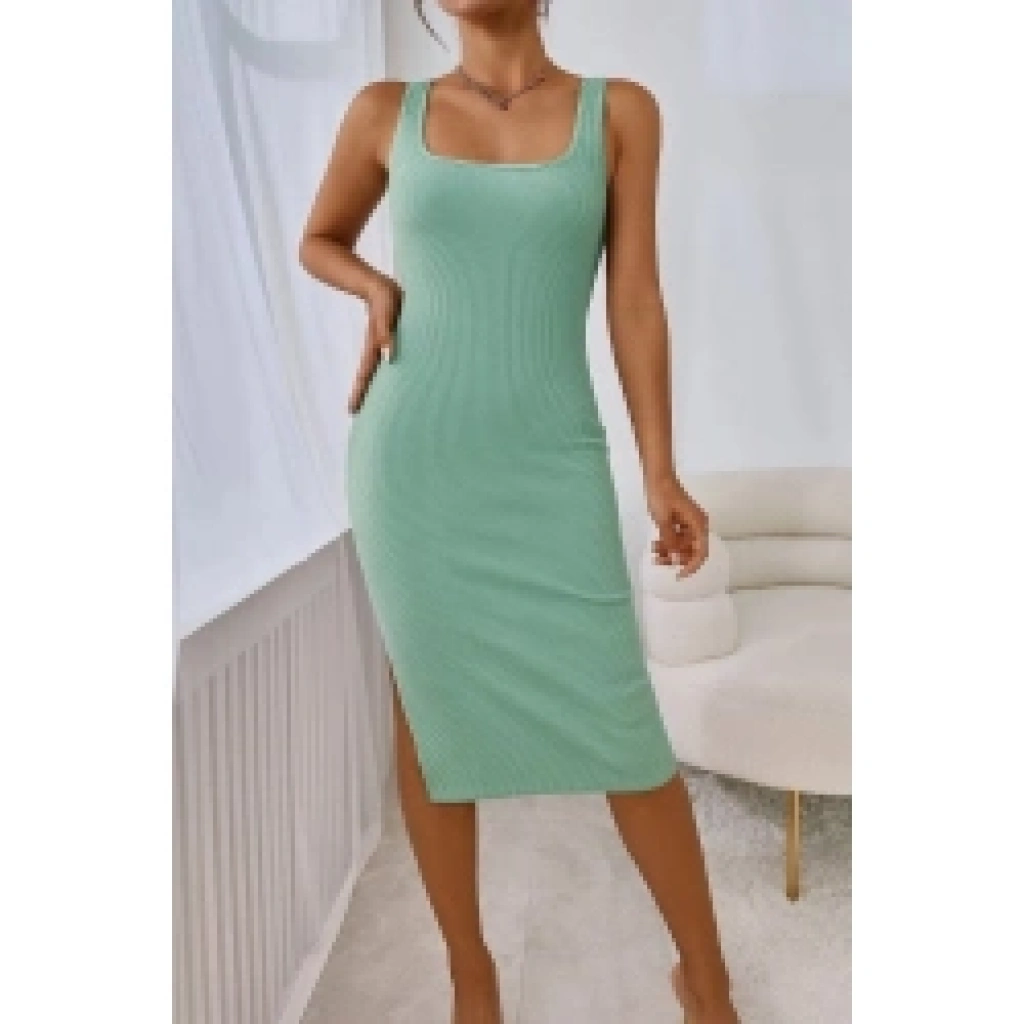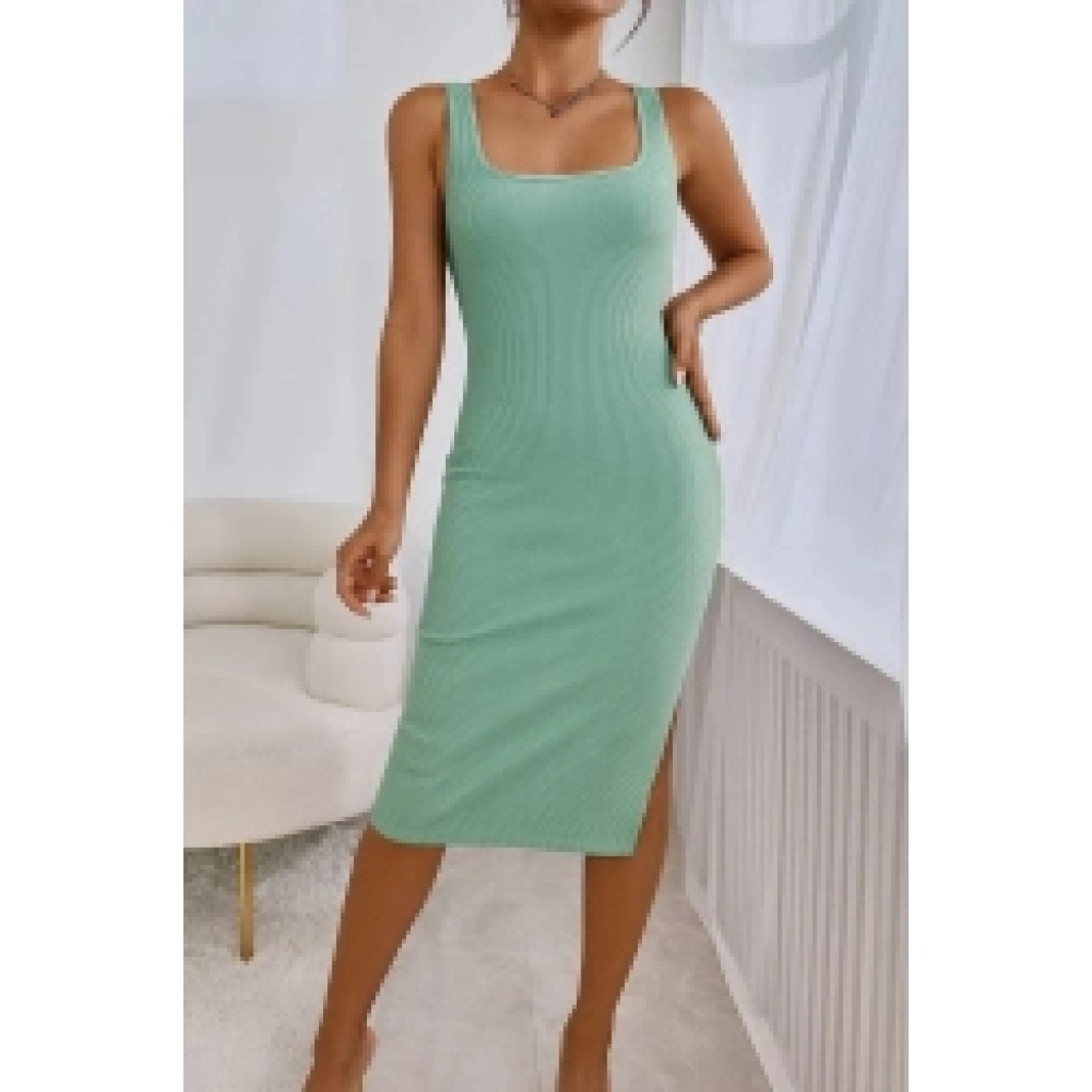 Kadın Askılı Kare Yaka Yandan Yırtmaçlı Midi Kaşkorse Elbise