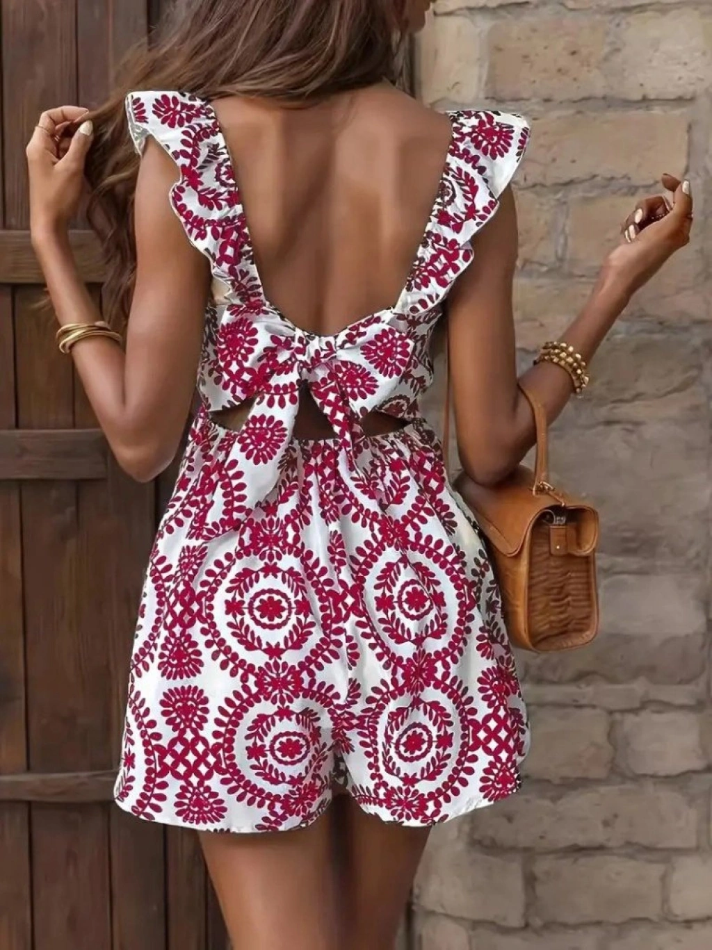 Kadın Askılı Kare Yakalı Arkadan Bağcıklı Desenli Keten Tulum