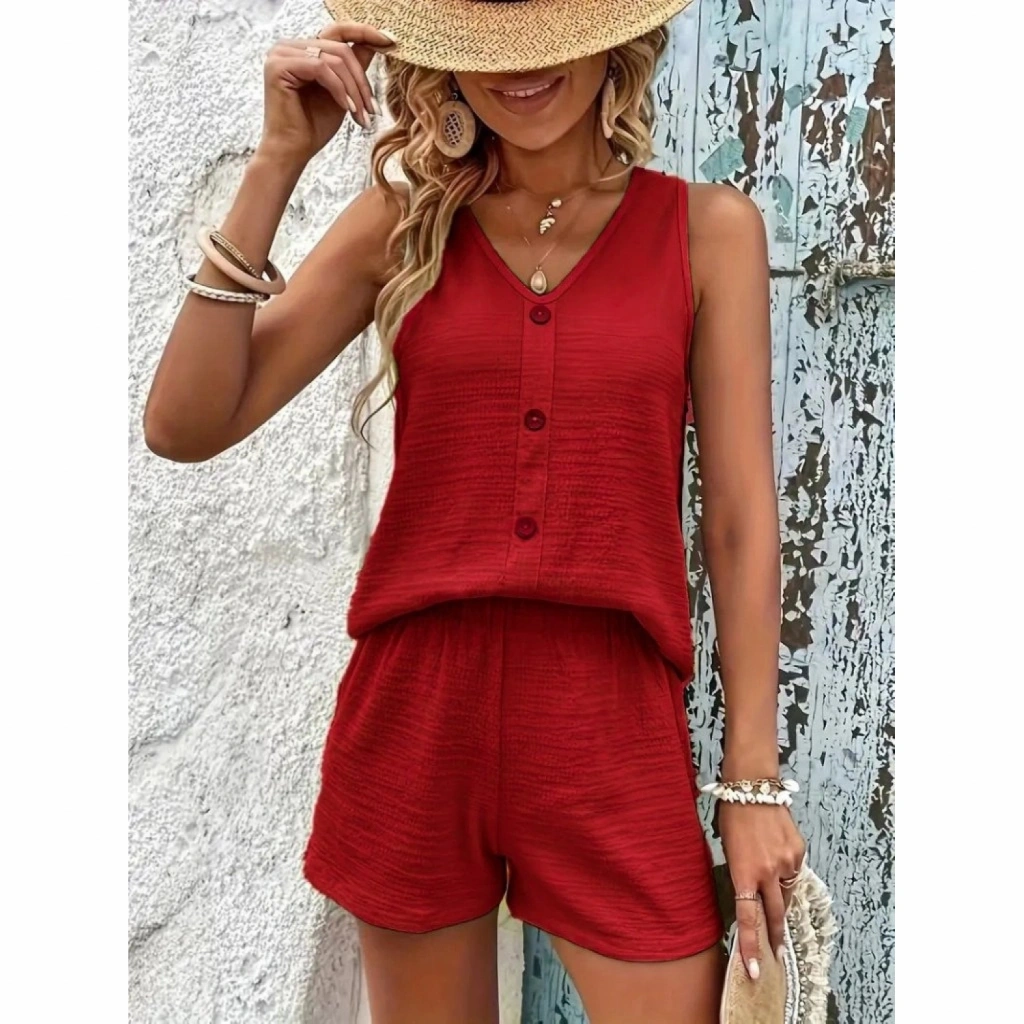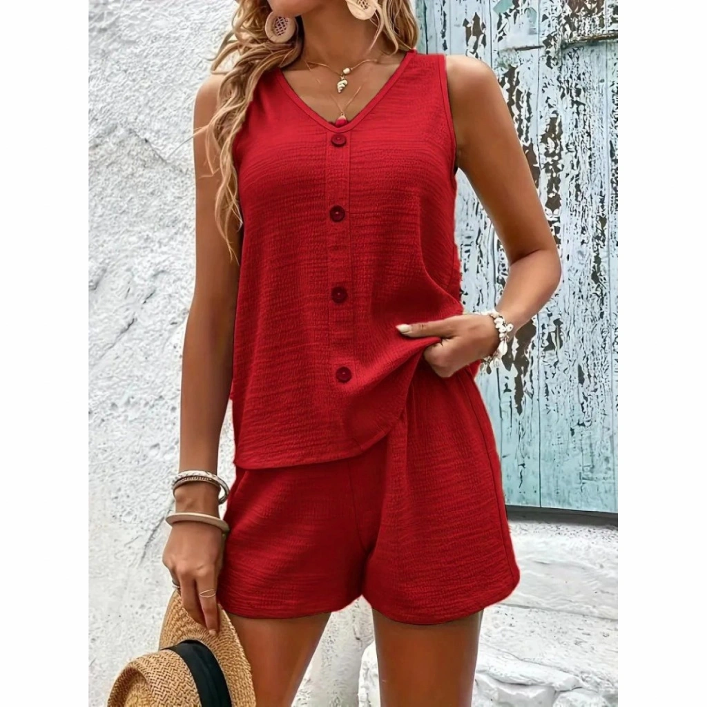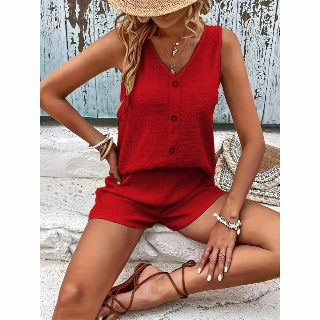 Kadın Askılı Kolsuz V Yakalı önden Düğmeli Bürümcük Bluz Ve Short Ikili Takım