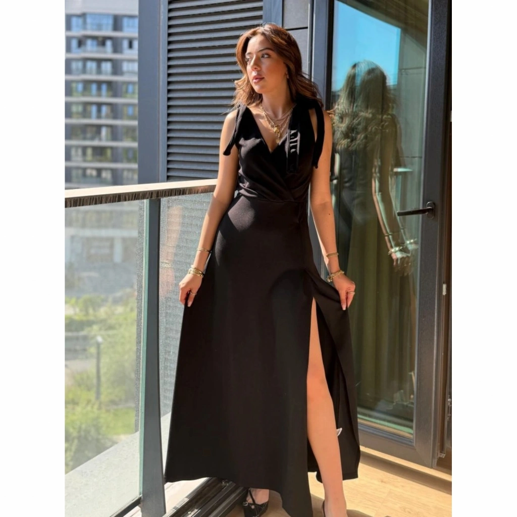 Kadın Askılı Omuzdan Bağlamalı Kruvaze Yakalı Uzun Yırtmaçlı Janjan Krep Elbise
