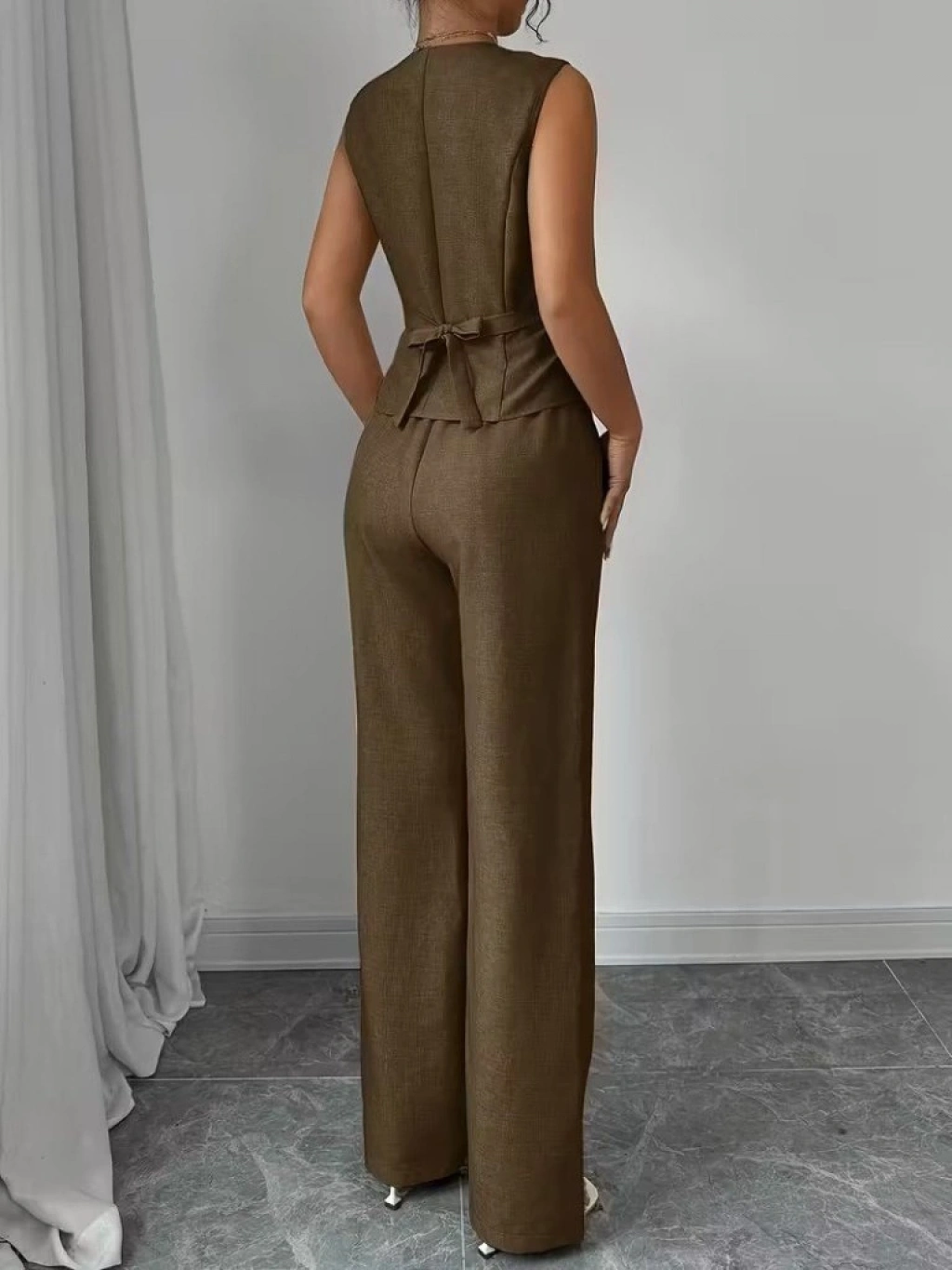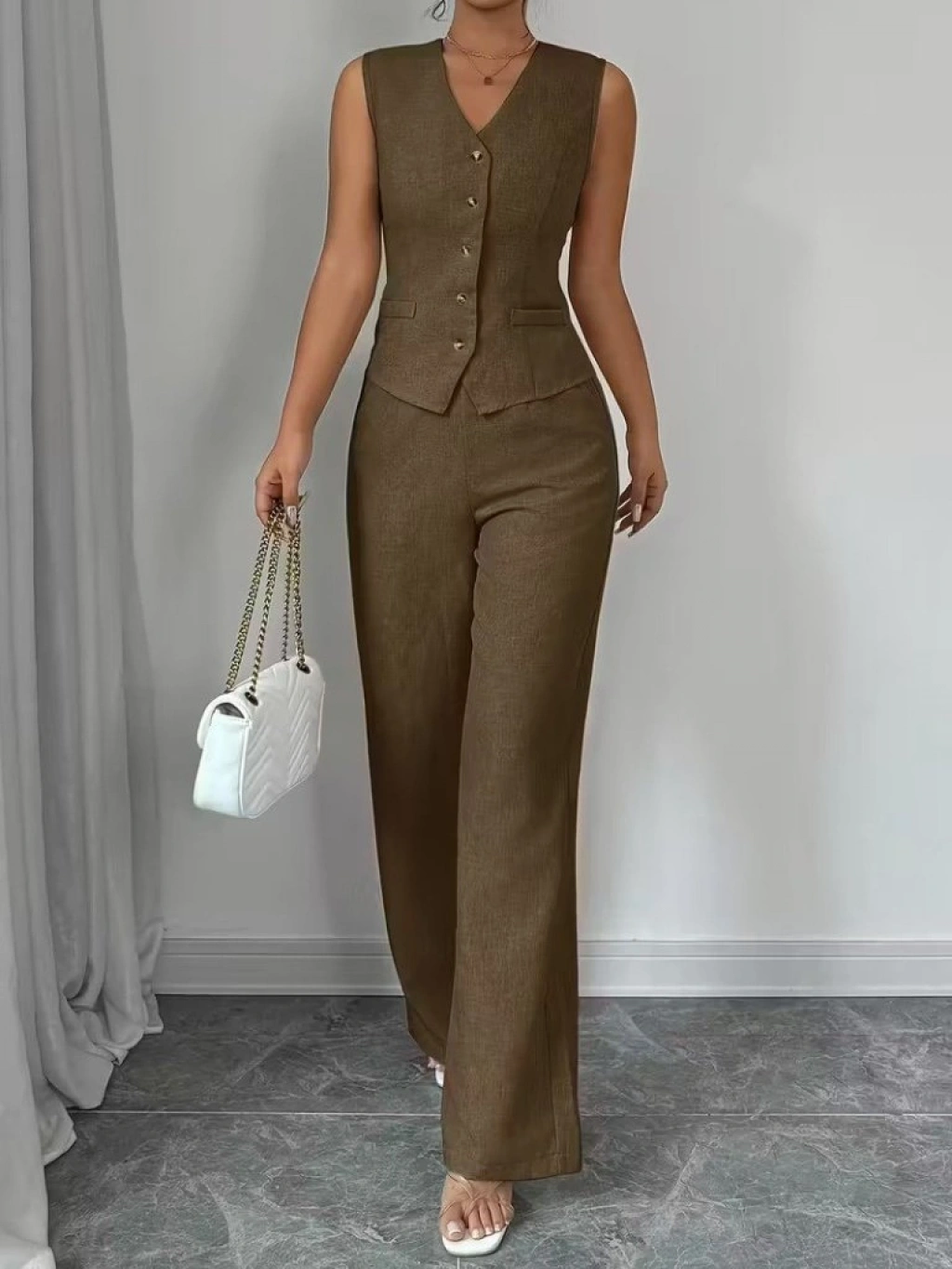 Kadın Askılı önden Düğmeli Bluz Ve Pantolon Keten Ikili Takım
