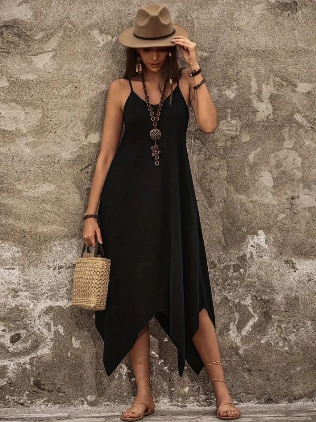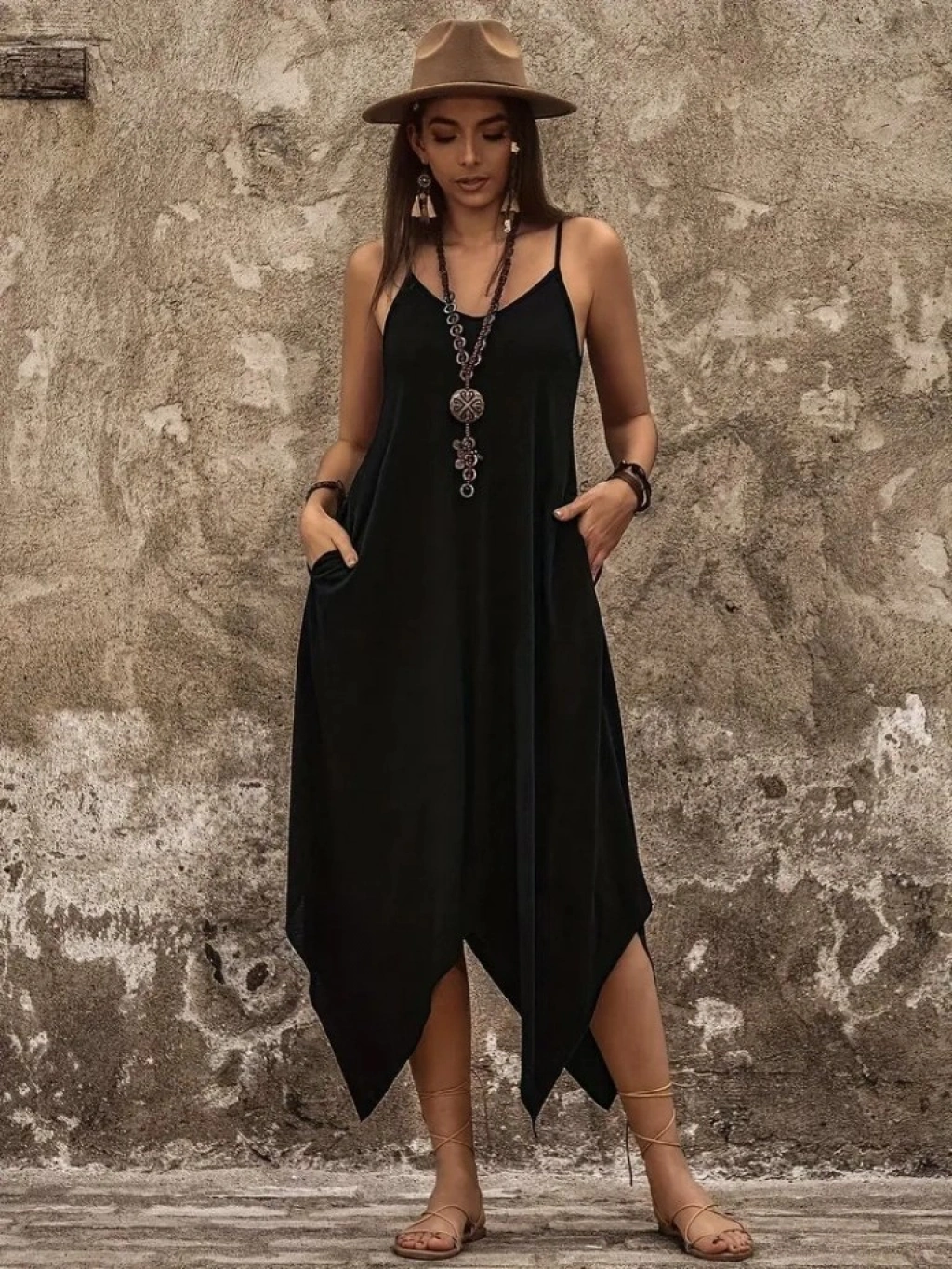 Kadın Askılı V Yakalı Cep Detaylı Asimetrik Kesim Detaylı Viskon Elbise
