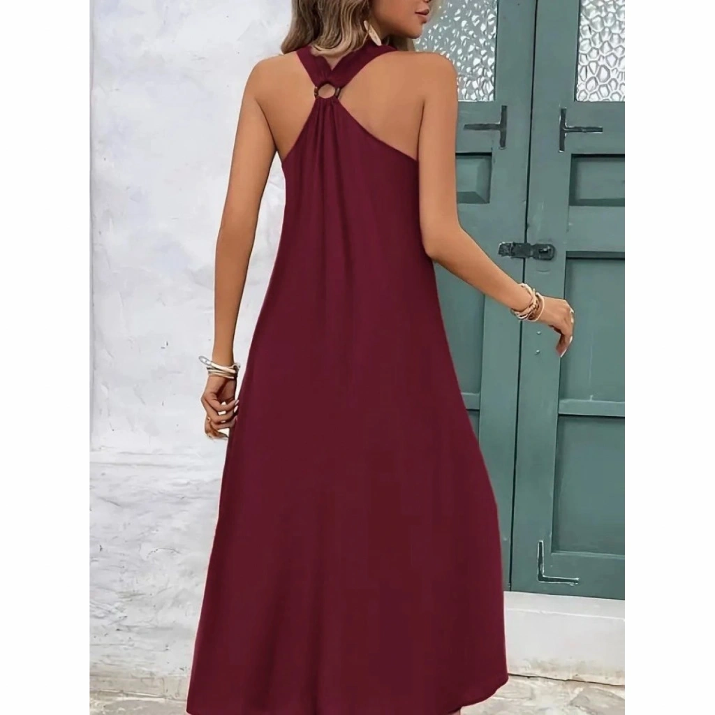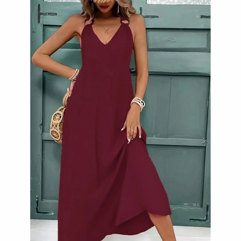 Kadın Askılı V Yakalı Halka Detaylı Maksi Boy Viskon Elbise