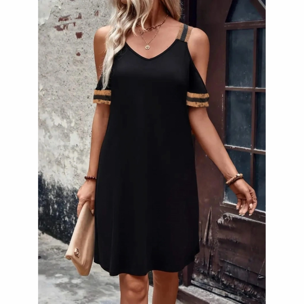 Kadın Askılı V Yakalı Omuzlardan Açık Kısa Viskon Elbise