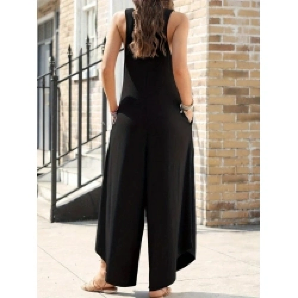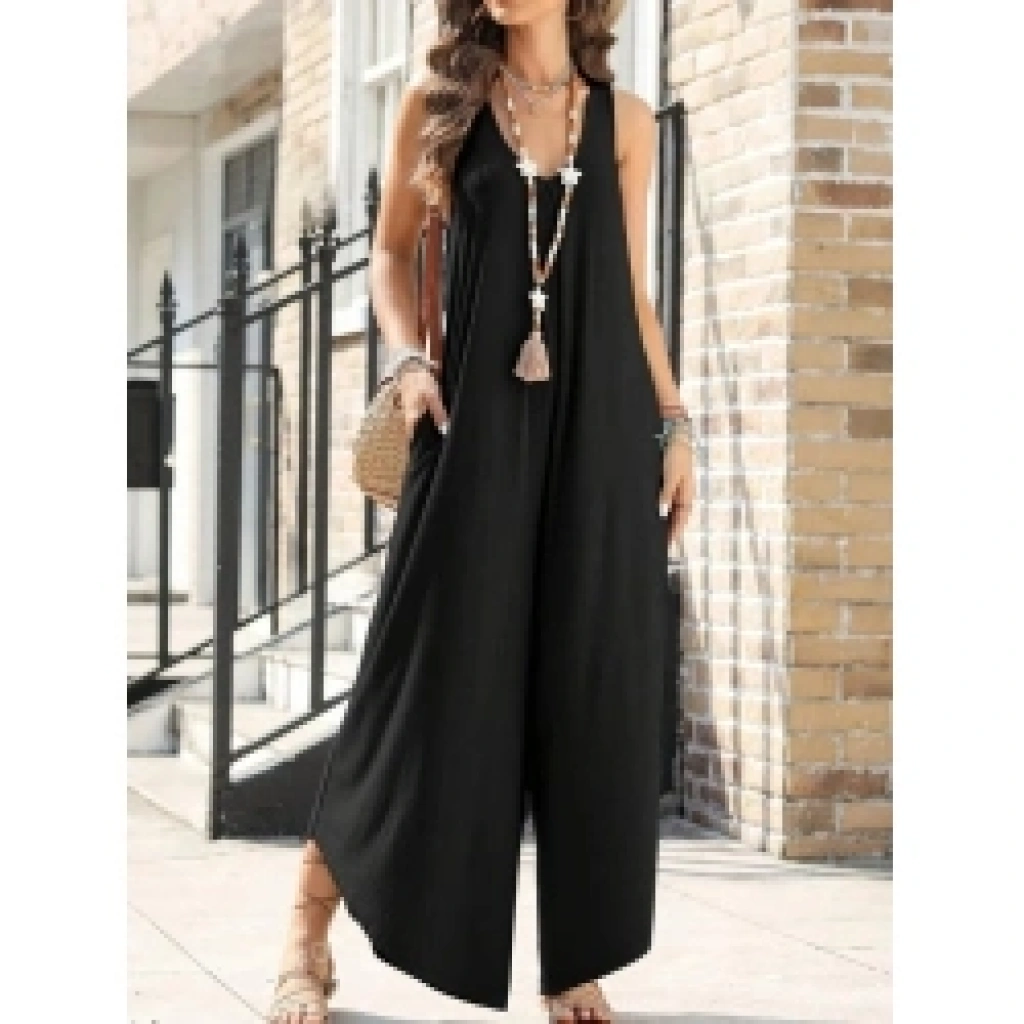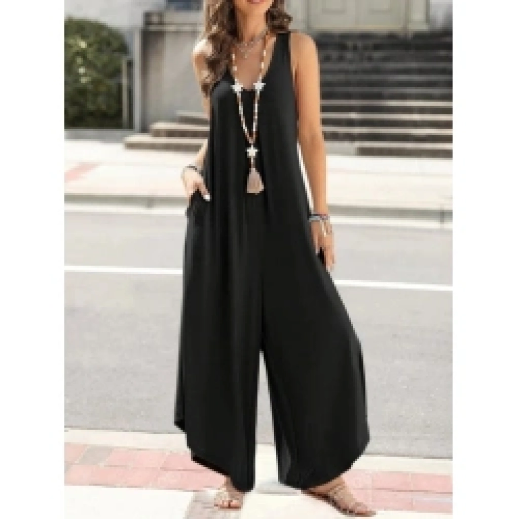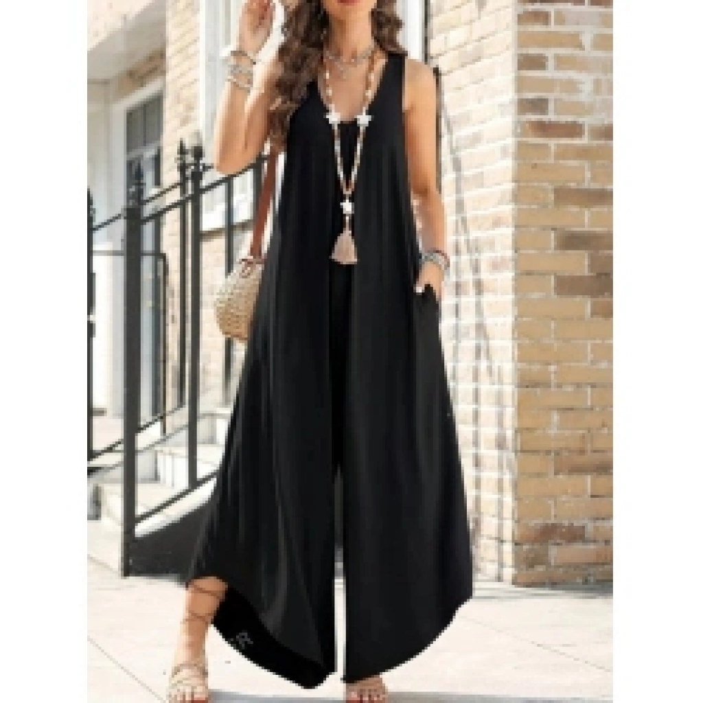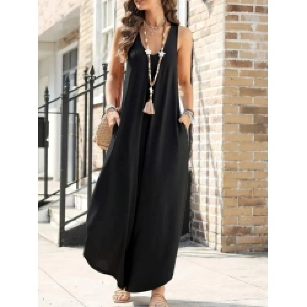 Kadın Askılı Yuvarlak Yaka Cepli Salaş Uzun Viskon Tulum