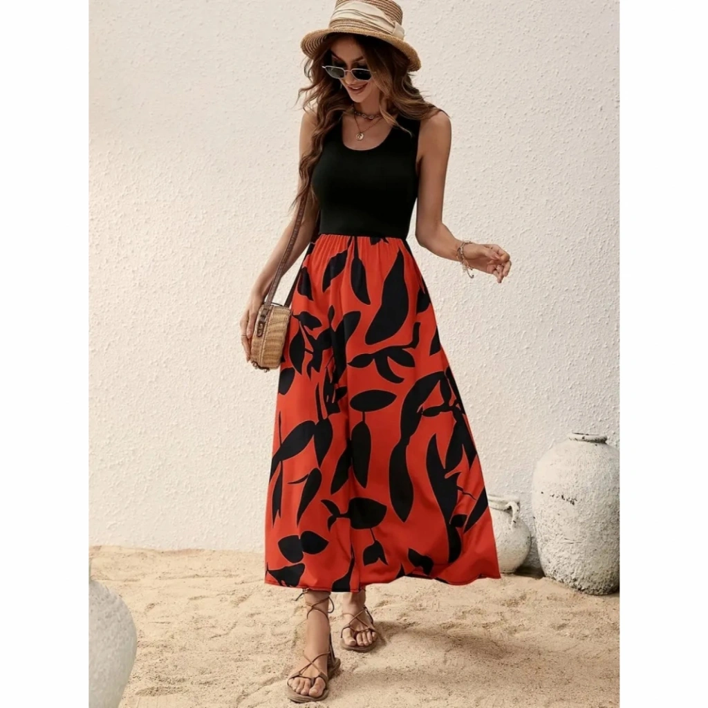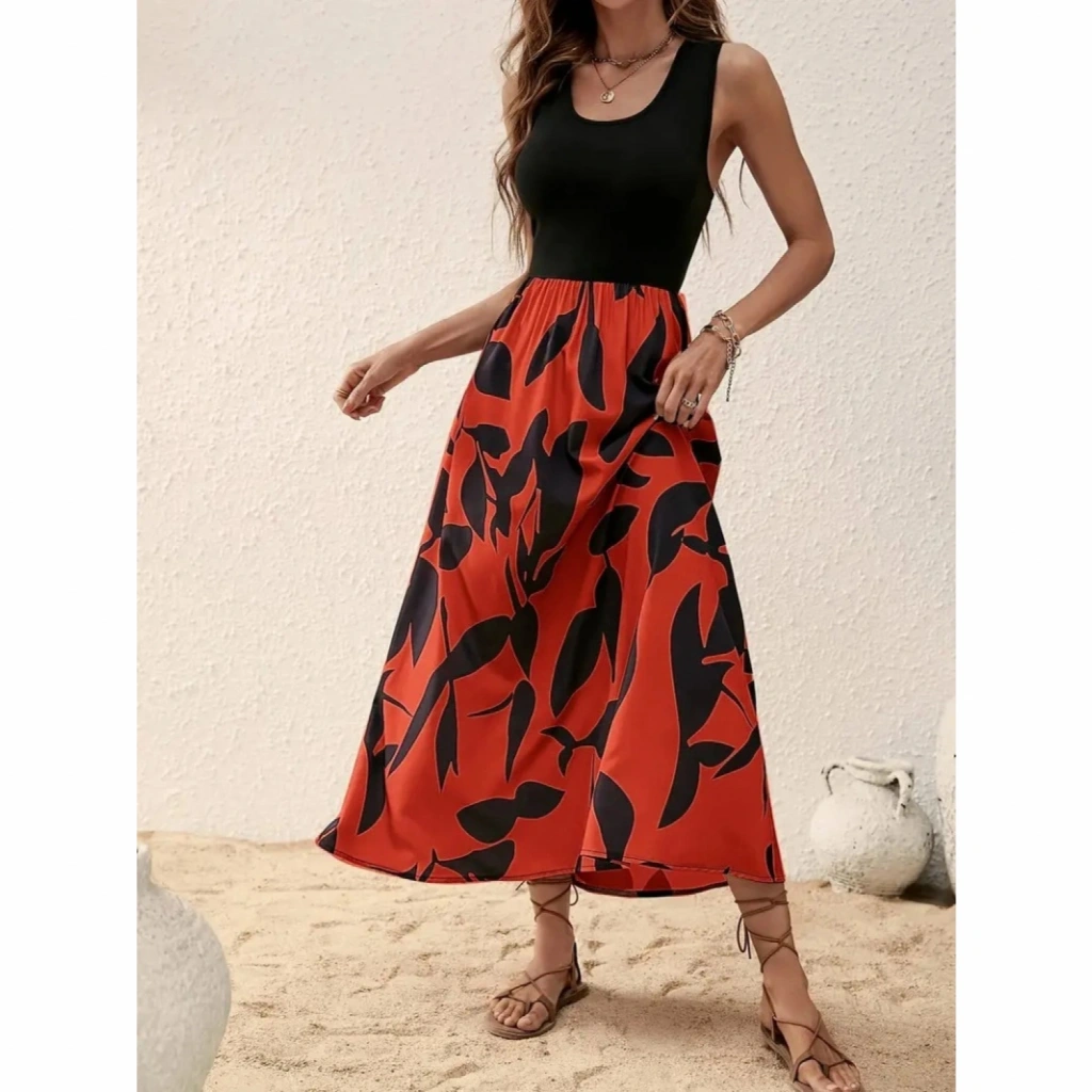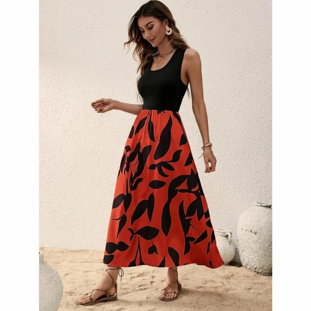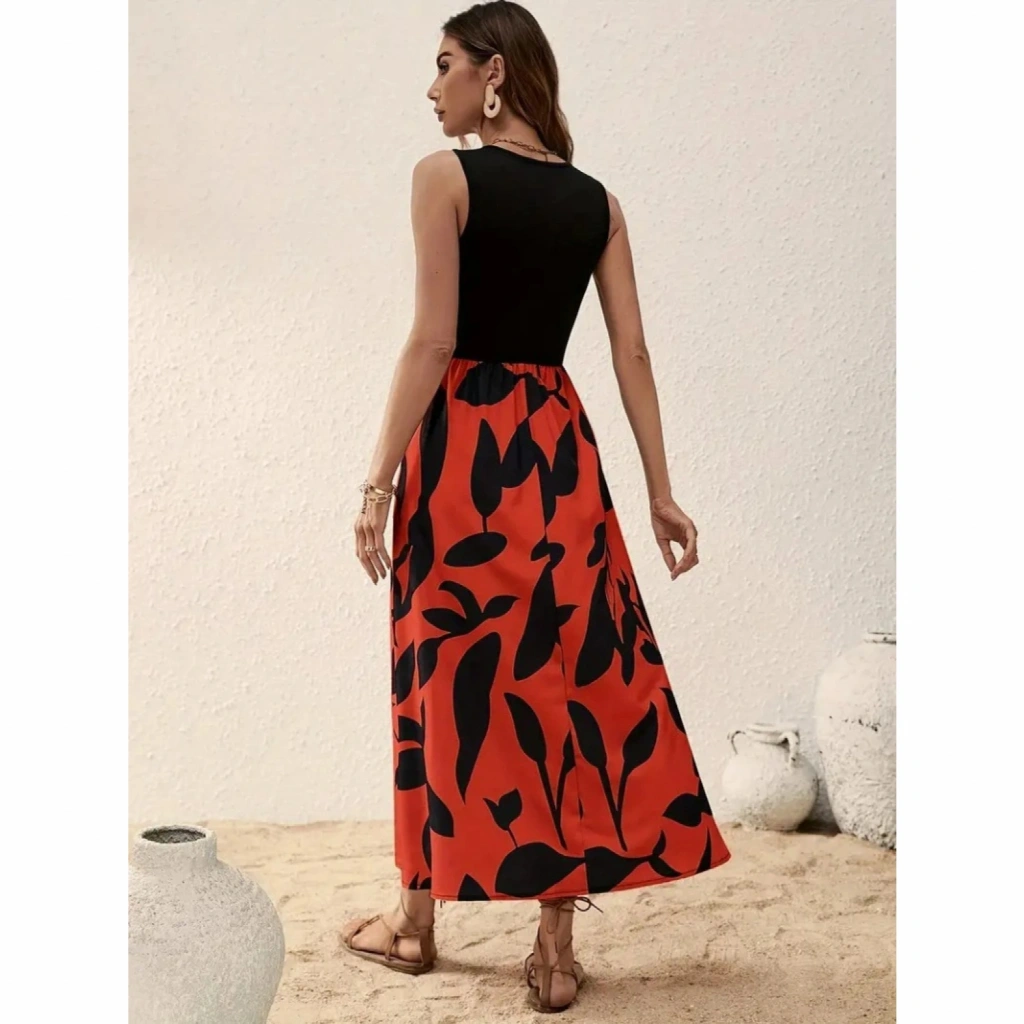 Kadın Askılı Yuvarlak Yaka üst Viskon Alt Desenli Uzun Süprem Elbise