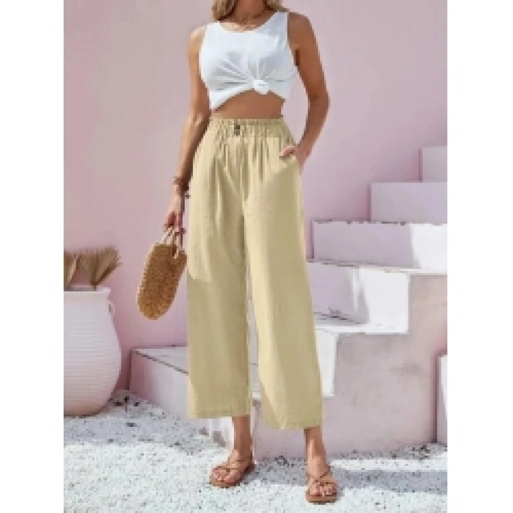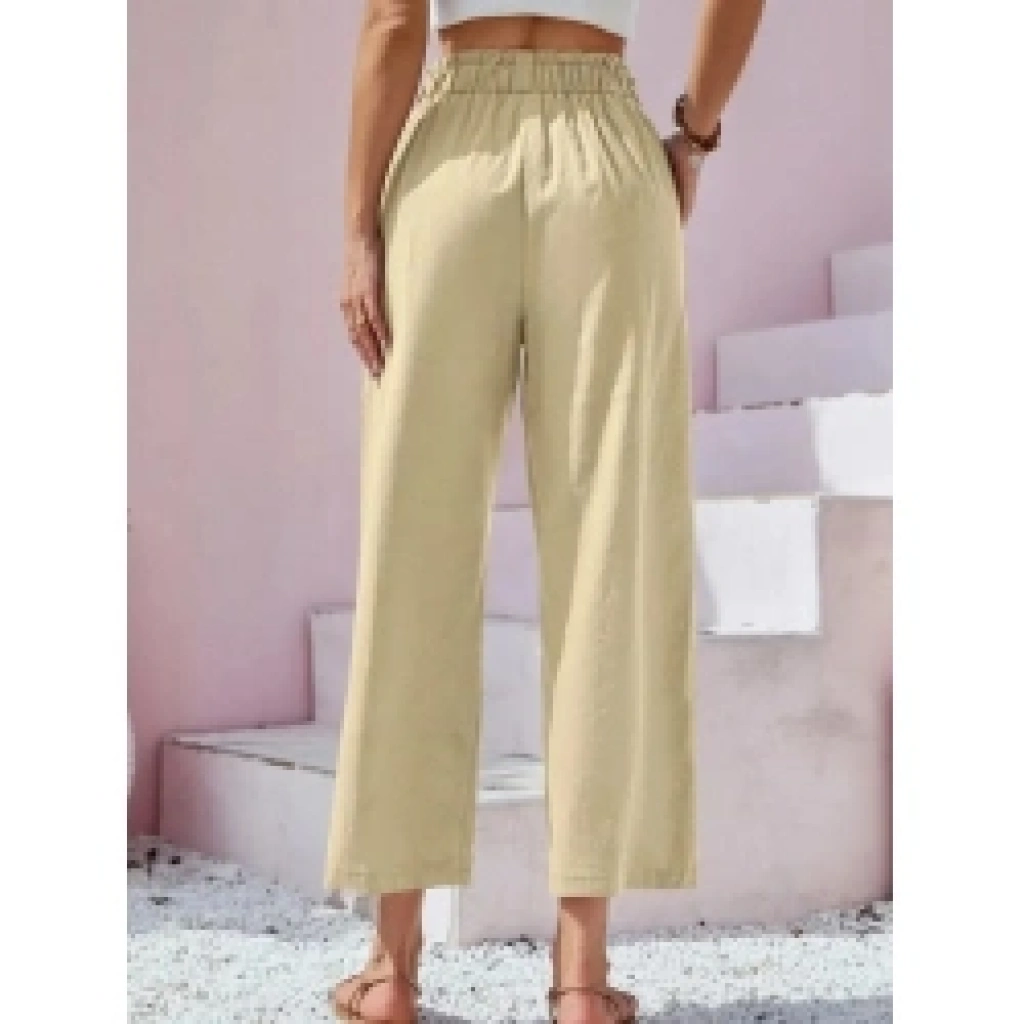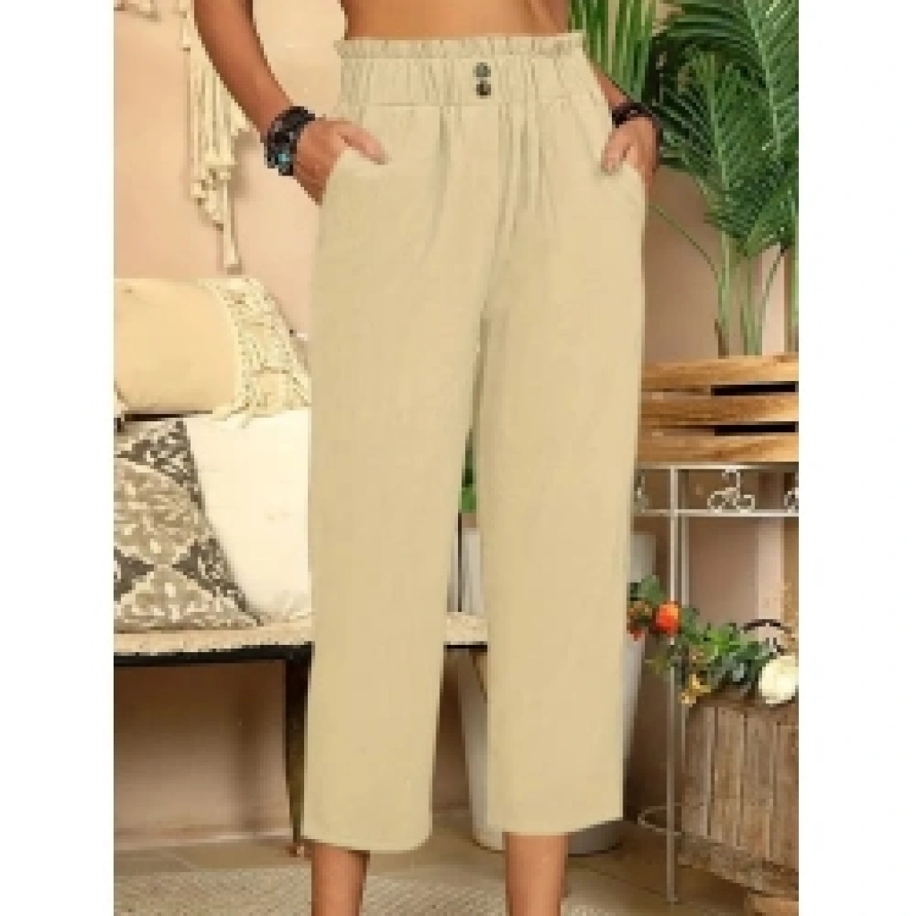 Kadın Bel Büzgü Ve Düğme Detay Kapri Keten Pantolon