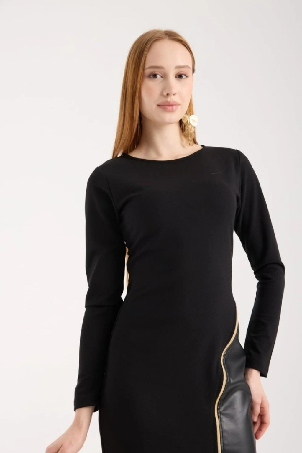 Kadın Bisiklet Yaka Uzun Kollu Deri Ve Fermuar Detay Mini Yırtmaçlı Elbise