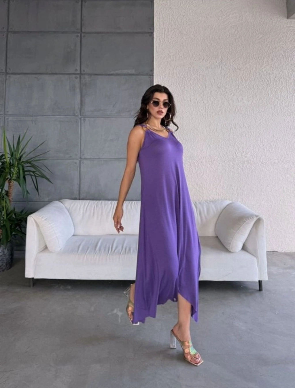 Kadın çan Dokuma Kumaş V Yaka Asimetrik Kesim Elbise