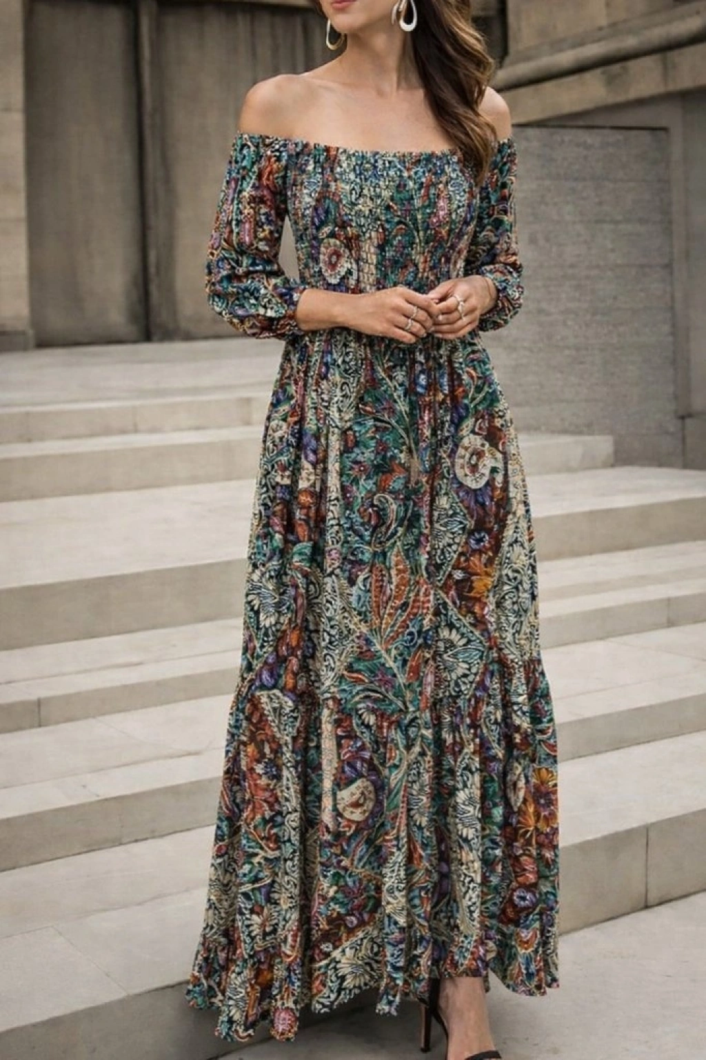 Kadın Düşük Omuzlu Beli Büzgülü Dijital Desenli Kesik Elyaf Süprem Uzun Elbise
