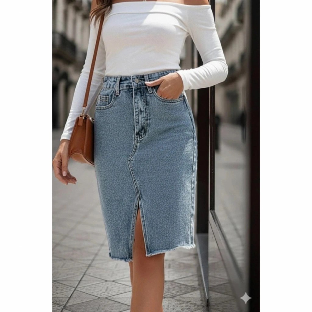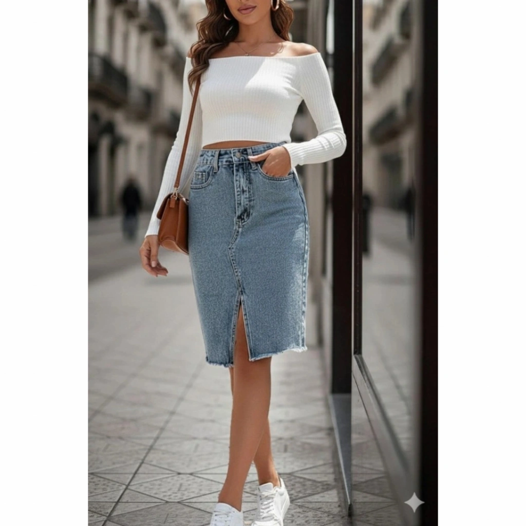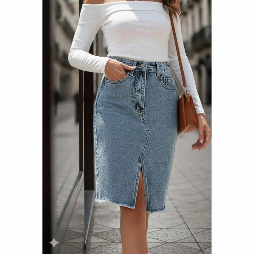 Kadın Elastik Bel Yırtık Kenar Detaylı Kot Etek