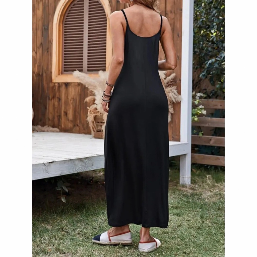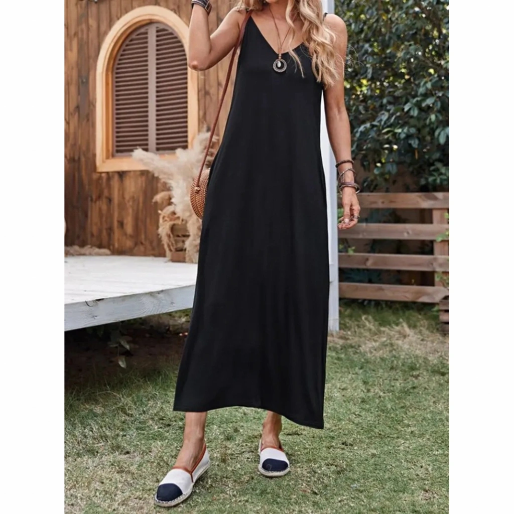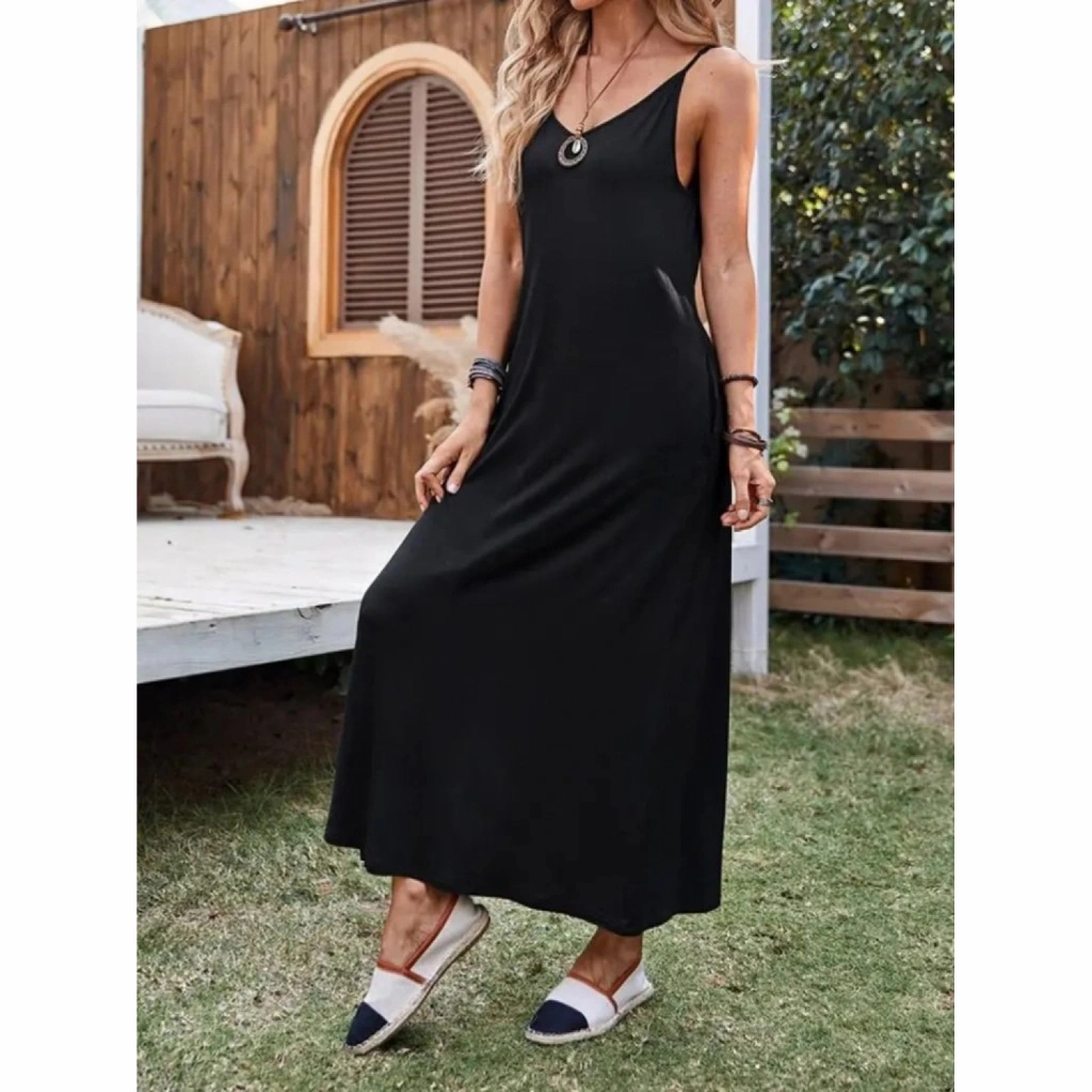 Kadın Ip Askılı Derin Geniş V Yakalı Uzun Viskon Elbise