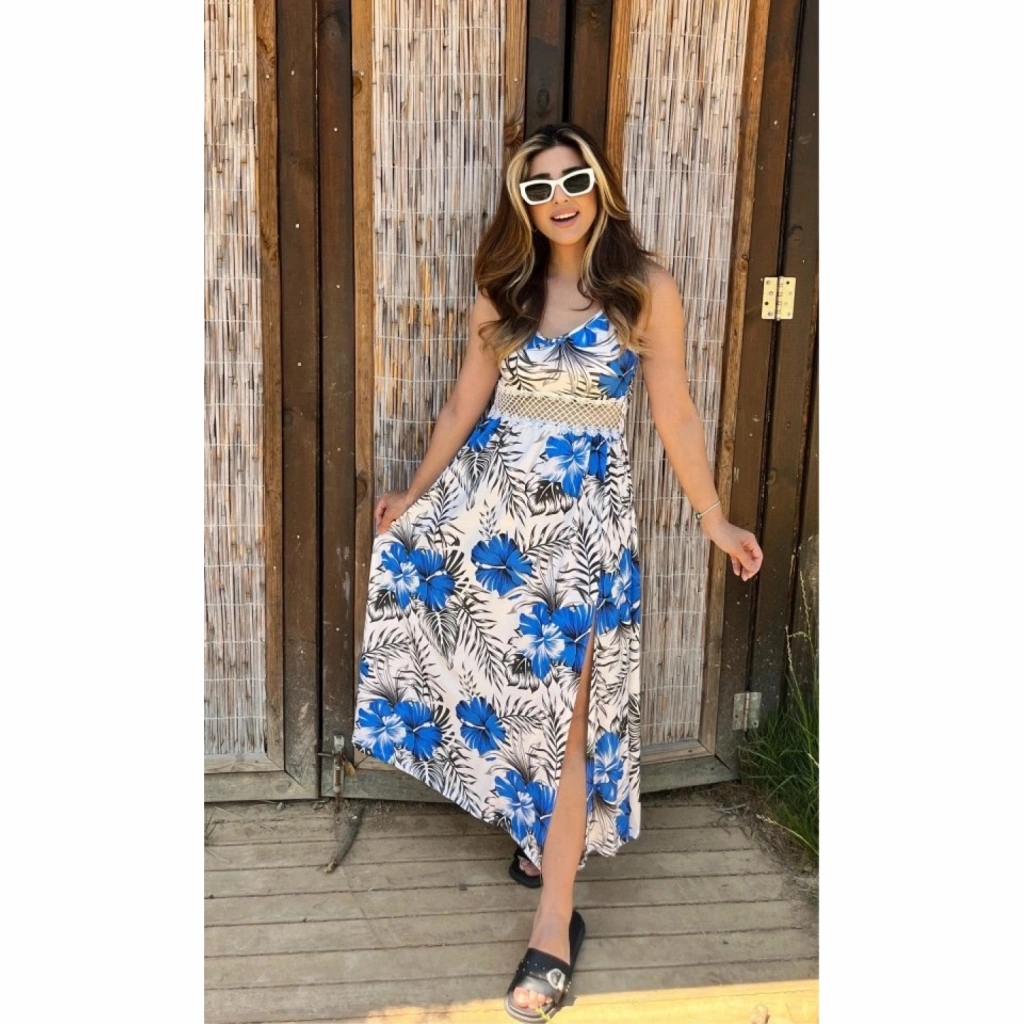 Kadın Ip Askılı V Yakalı Bel Güpür çiçek Desenli Yandan Yırtmaçlı Maksi Süprem Elbise