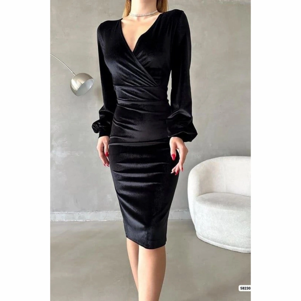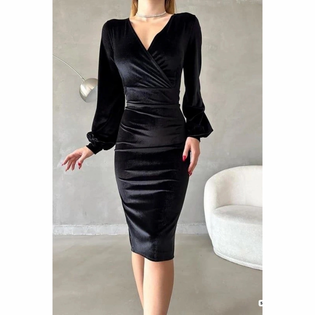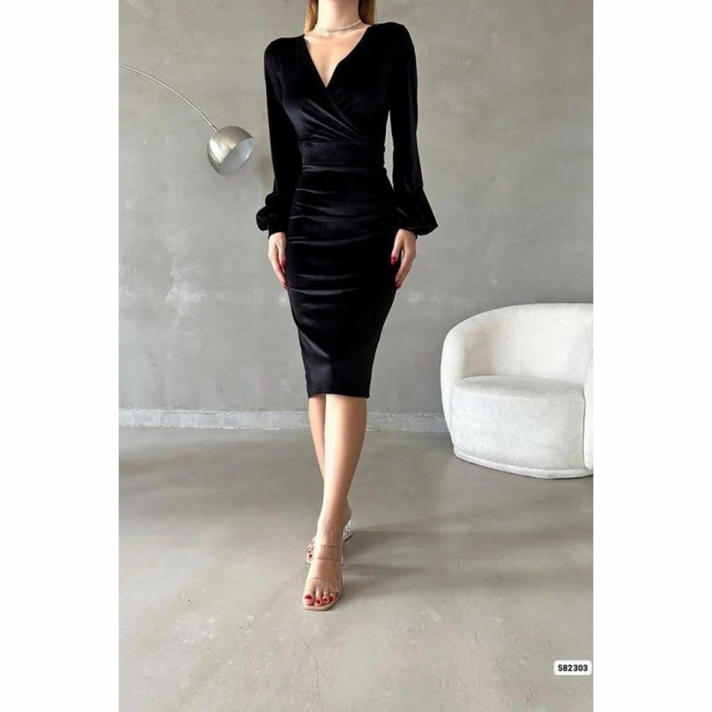 Kadın Kadife Kumaş Kruvaze Yaka Balon Kol Ve Yırtmaç Detaylı Midi Boy Elbise