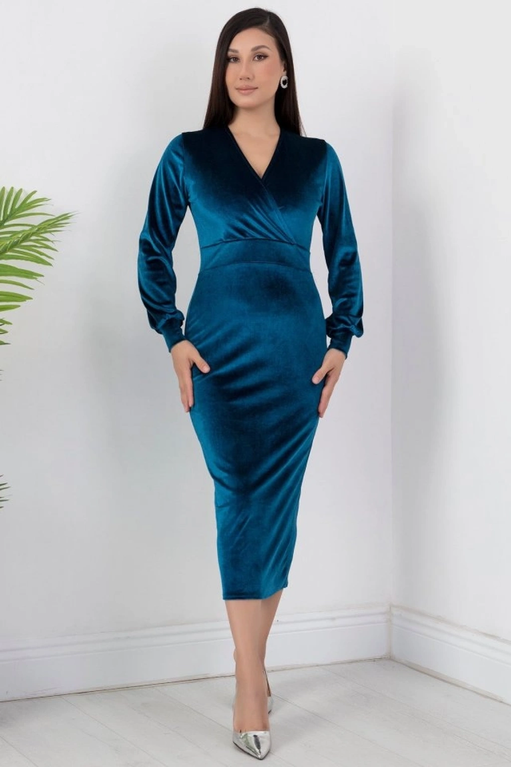 Kadın Kadife Kumaş Manşetli V Yaka Şık Kalem Elbise