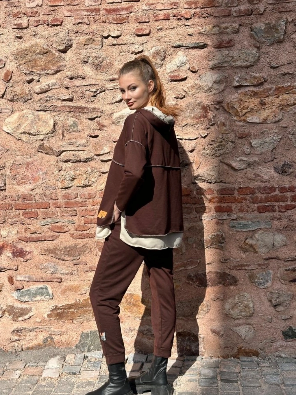 Kadın Kahve Kapşonlu Etek Ucu Detay Arma Ters Dikiş Gorunumlu Ikili Takım