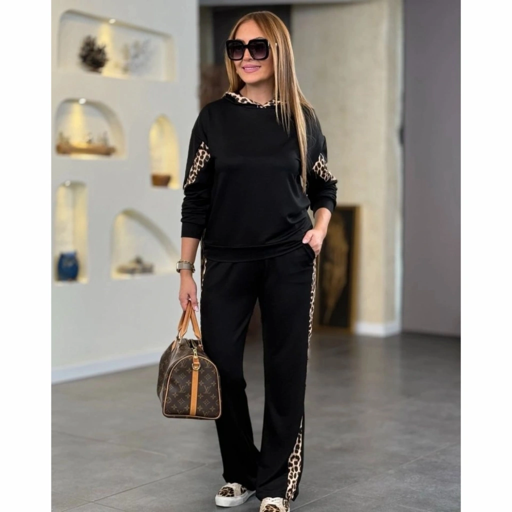 Kadın Kapüşonlu Leopar Detay Sweat Ve Yüksek Bel Yanları Leopar şeritli Bol Paça Pantolon Ikili Takım
