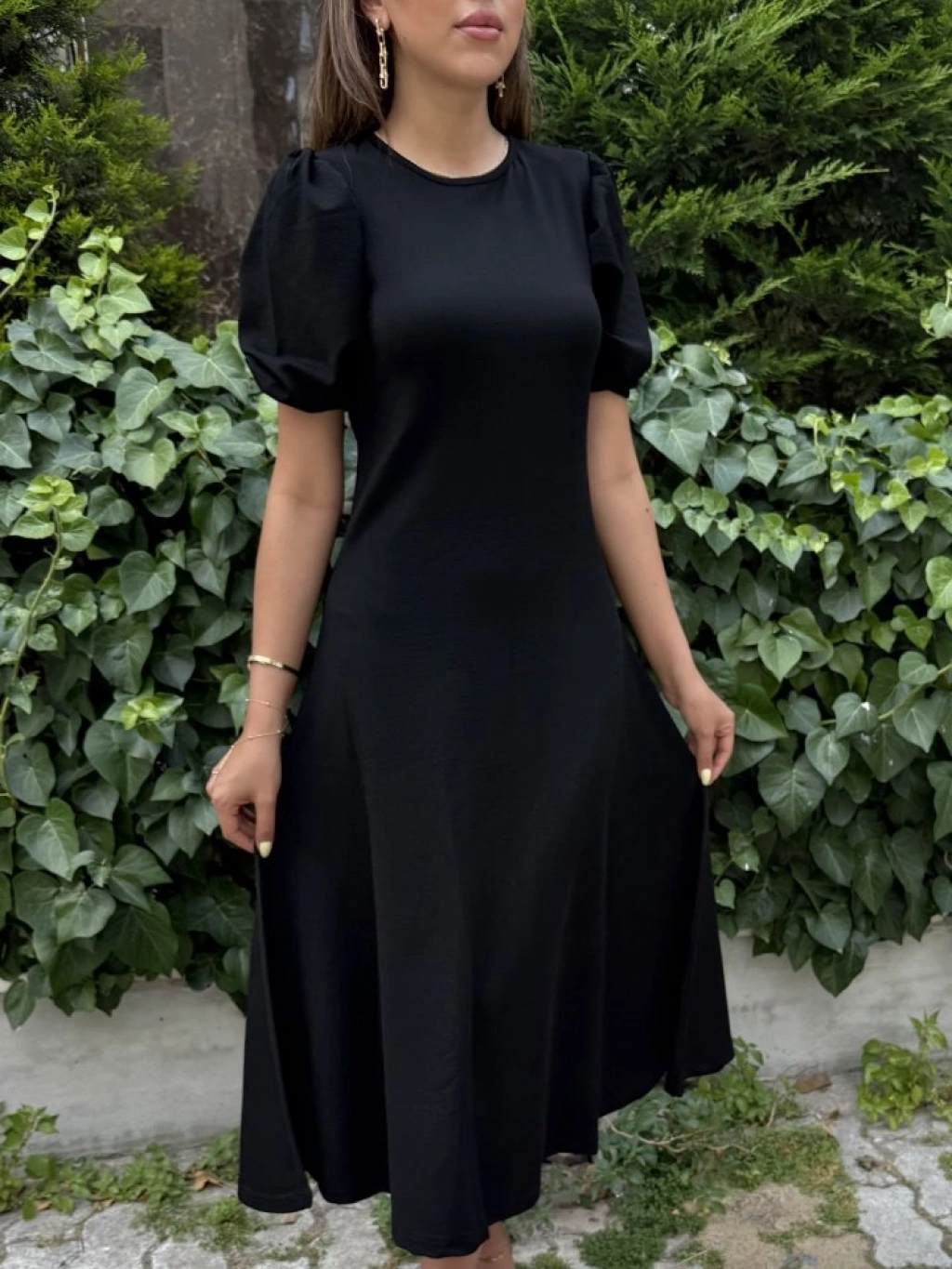 Kadın Kısa Balon Kollu Bisiklet Yaka Geniş Kesim Janjan Krep Elbise