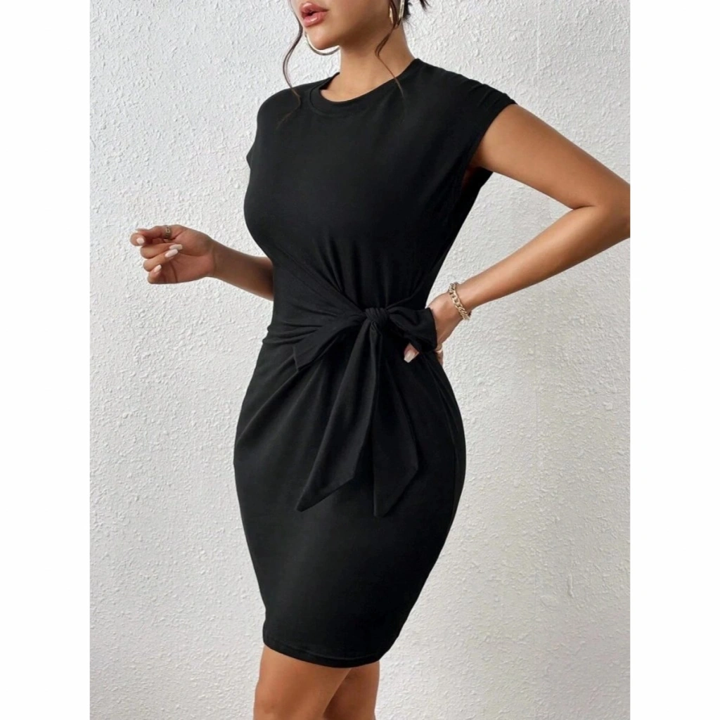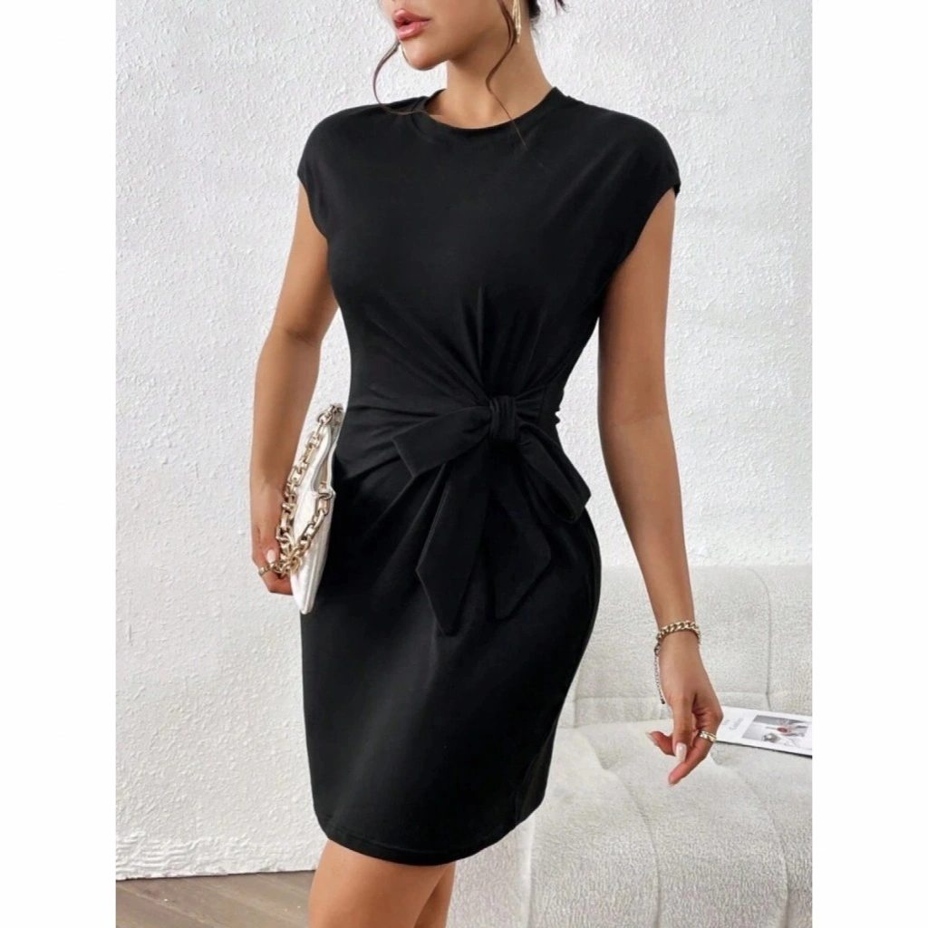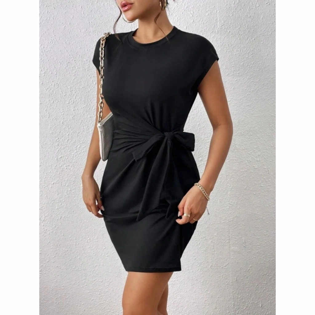 Kadın Kısa Kap Kollu Bisiklet Yaka Belden Bağlamalı Modal Mini Elbise