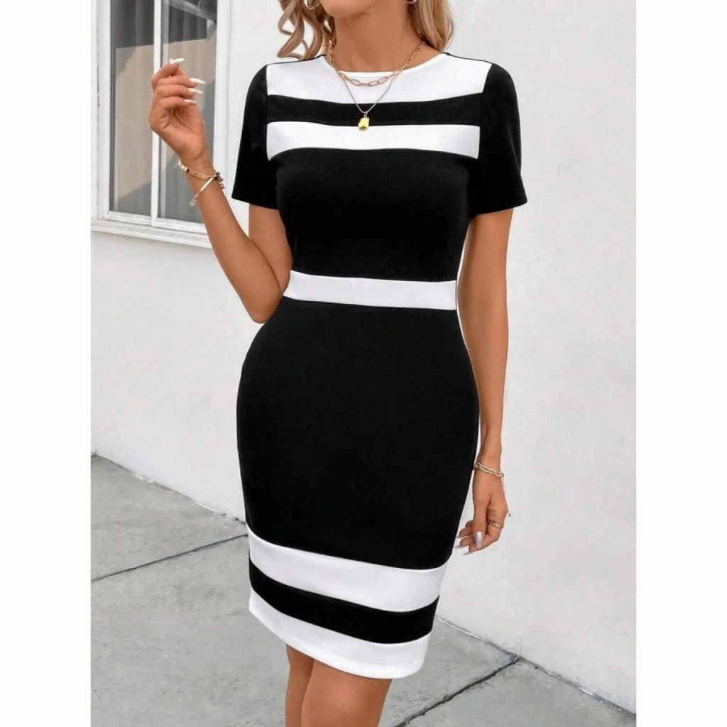 Kadın Kısa Kollu Bisiklet Yaka çift Renkli Ithal Krep Elbise