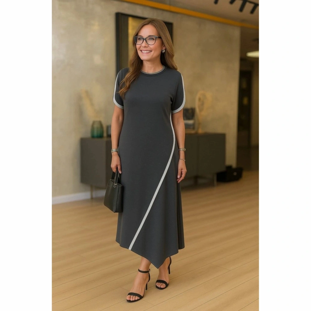 Kadın Kısa Kollu Bisiklet Yaka çift şerit Renk Detaylı Asimetrik Kesim Viskon Iki Iplik Elbise