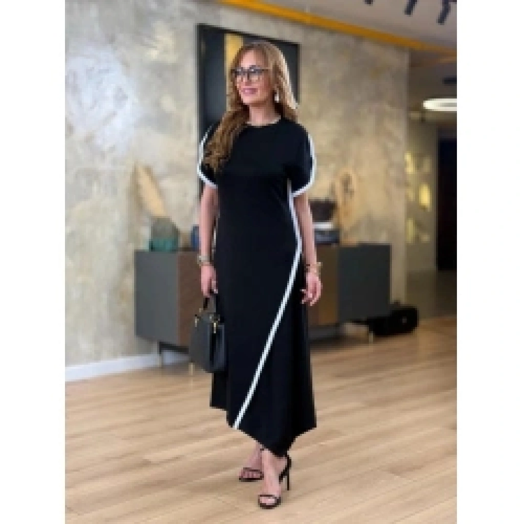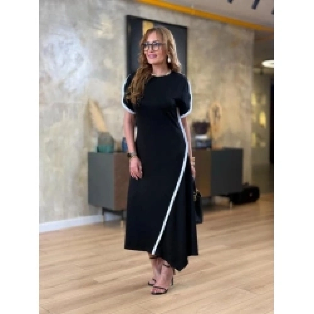 Kadın Kısa Kollu Bisiklet Yaka çift şerit Renk Detaylı Asimetrik Kesim Viskon Iki Iplik Elbise
