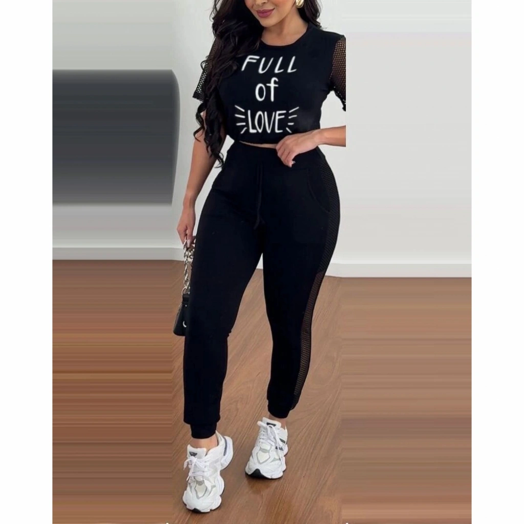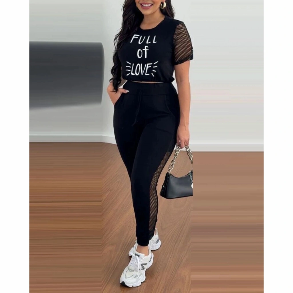 Kadın Kısa Kollu Bisiklet Yaka File Detaylı Viskon Iki Iplik Krop Ve Eşofman Altı Ikili Takım