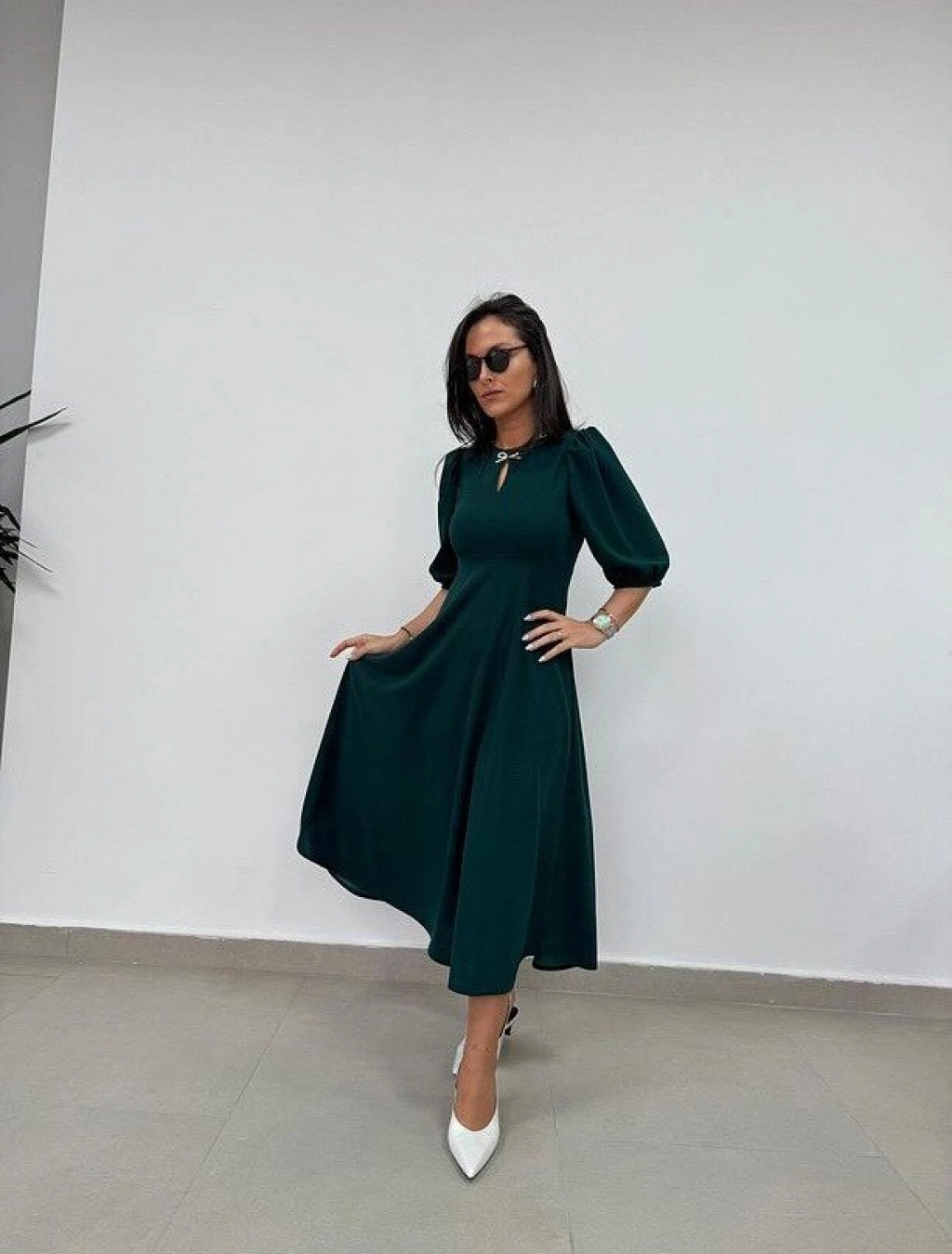 Kadın Kısa Kollu Bisiklet Yaka Fiyonk Broşlu Midi Janjan Krep Elbise