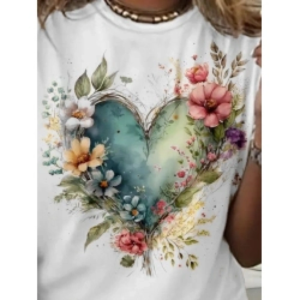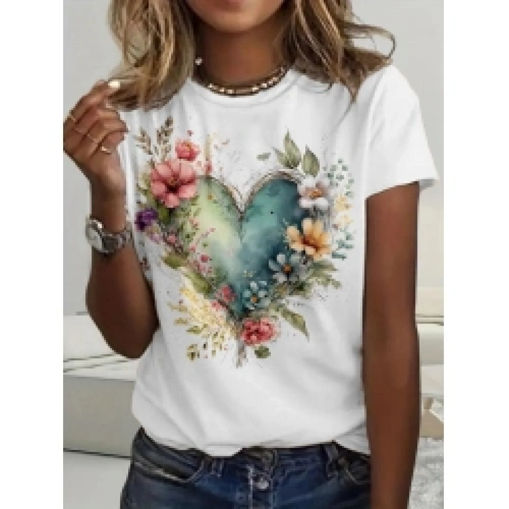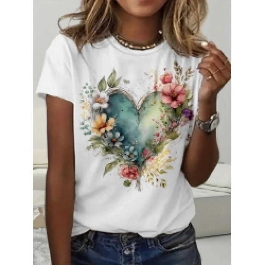 Kadın Kısa Kollu Bisiklet Yaka Kalp Desenli Süprem Bluz