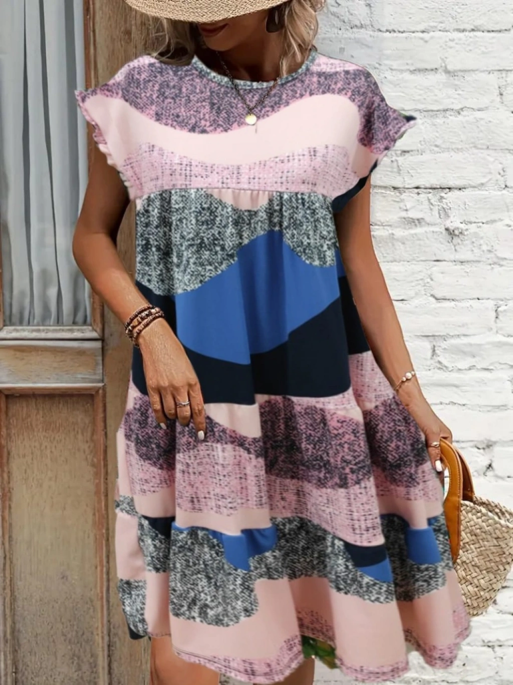 Kadın Kısa Kollu Bisiklet Yaka Kare Desenli Dalgıç Elbise