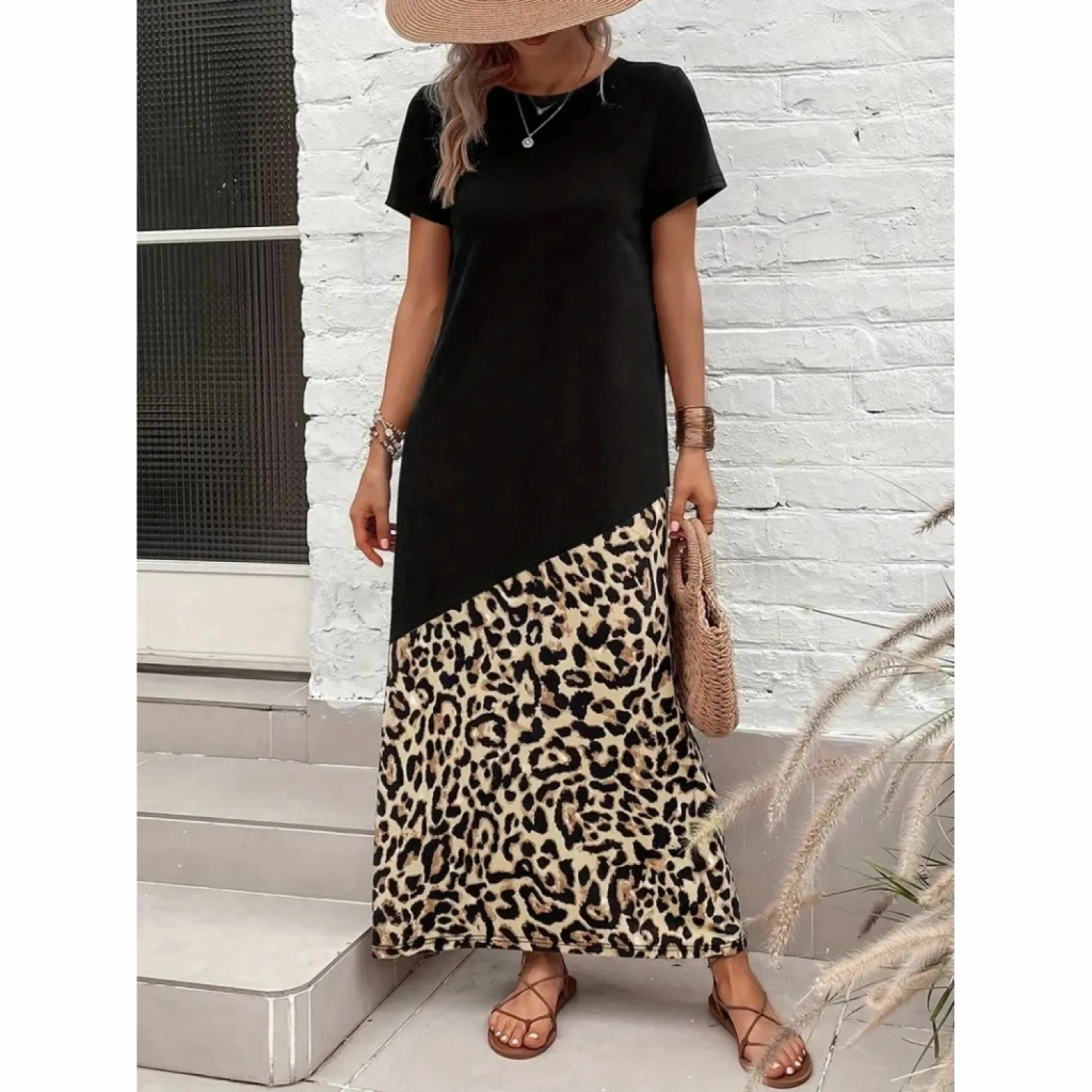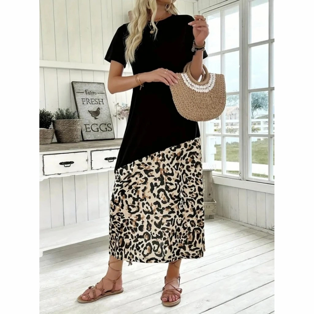 Kadın Kısa Kollu Bisiklet Yaka Leopar Detaylı Midi üst Viskon Alt Süprem Elbise
